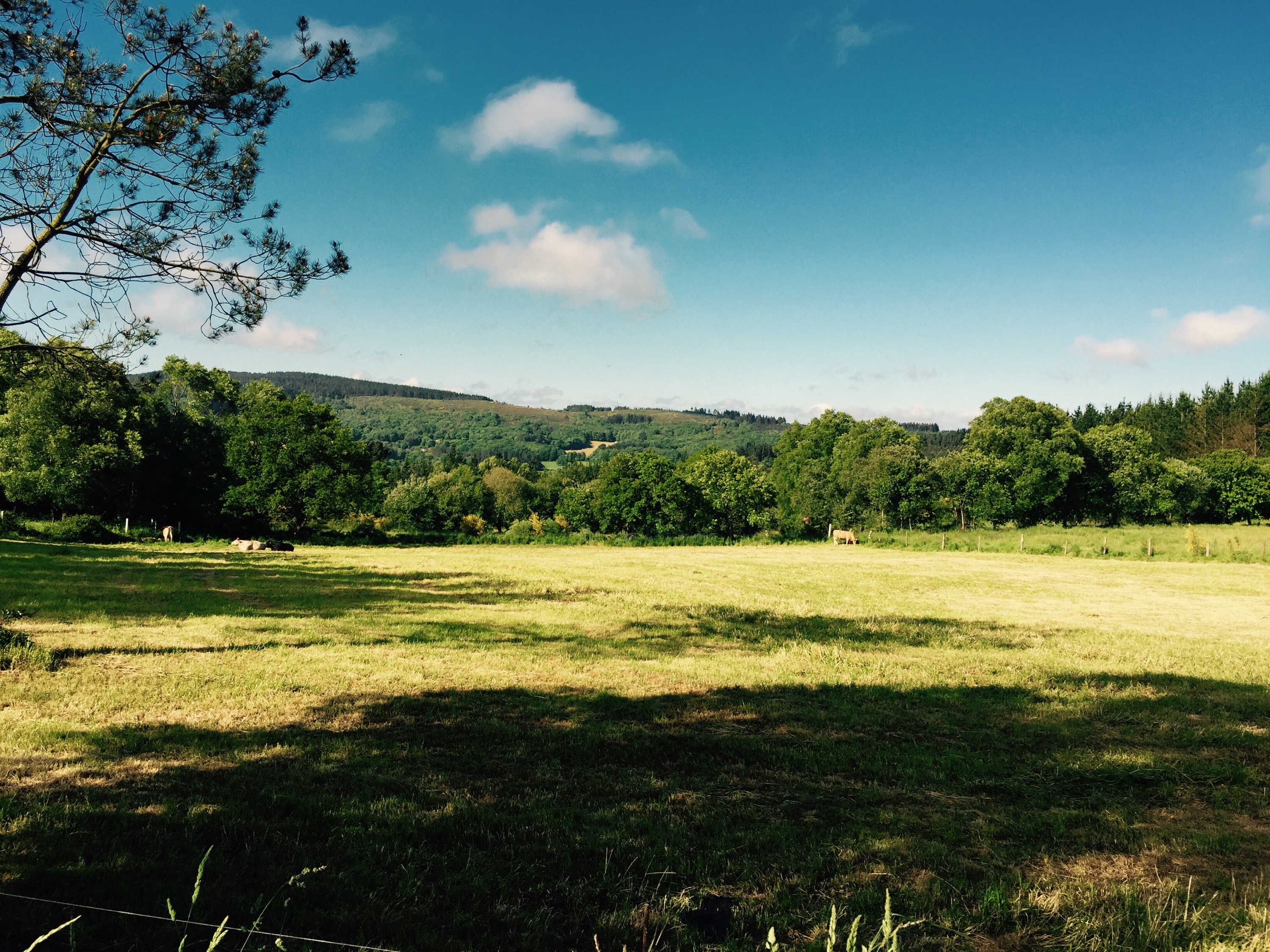 Once at the top, we followed paths and roads and paths again through more rich farmland and some more industrial sized farms (chicken and cattle) than we had seen before… Jocelyn spoke of cows and flies in this area… We’re a little too early for the flies of summer, but where there wasn’t cows grazing, they had spread fresh manure on all the newly cut hay fields so there was no escaping the pervasive odor of these ruminants!