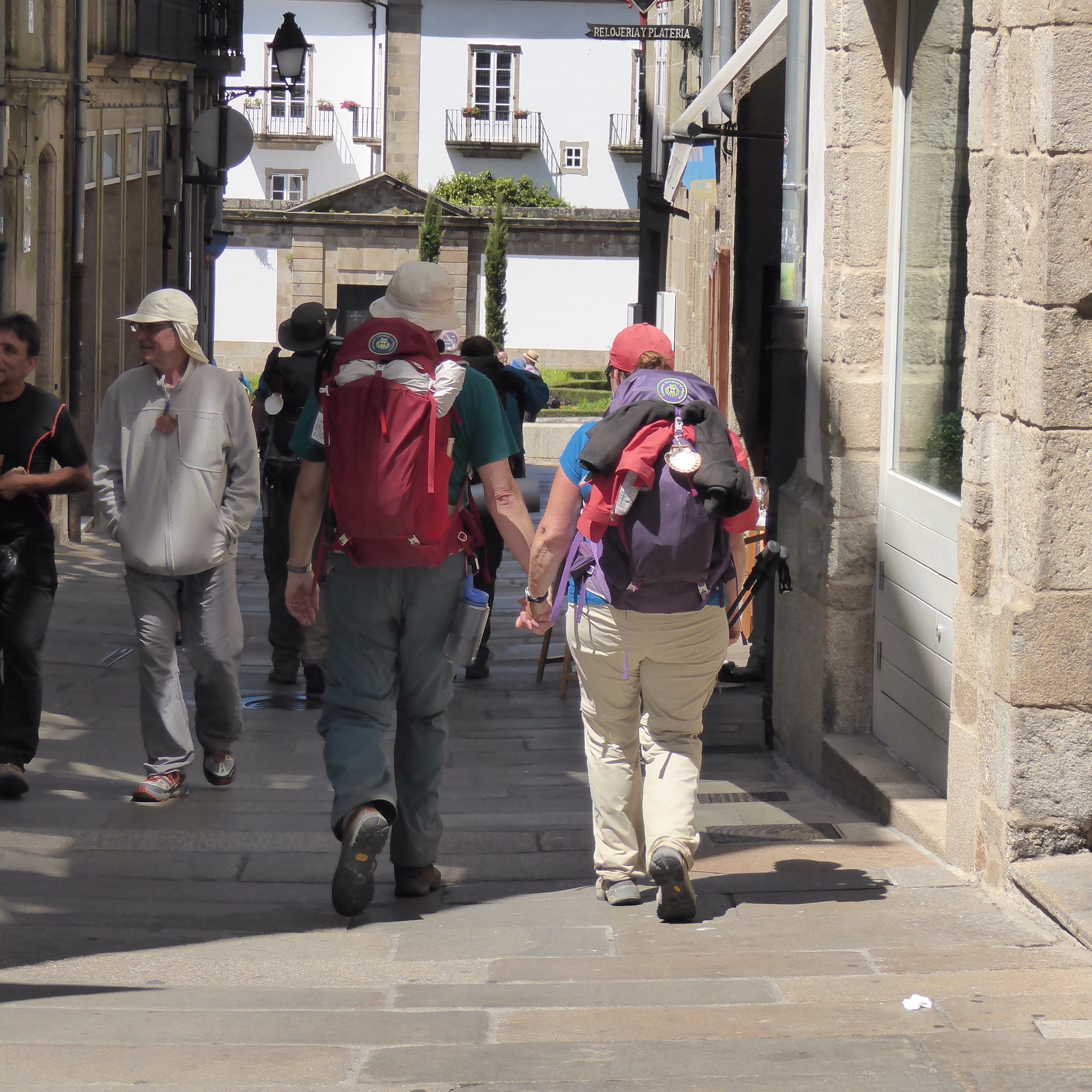 Now we were ready to enter the old city…. We walked through the streets, only blocks away from the cathedral and pilgrims before us greeted us with Buen Camino, as did the many locals. As we approached the church a 2 man band was playing some traditional Basque music, the crowds were thicker and as we reached the Cathedral it was clear that the noon mass had just finished! We met a few people we had seen along the way included Gregor who greeted us with warm hugs…. We also saw Natalie ( polish vegan that we first met in Orrison… How she survived on her diet is beyond me!!!) Marus our Latvian friend, Mikal, lutz and Rolf our German friends… It was certainly a warm celebratory atmosphere….