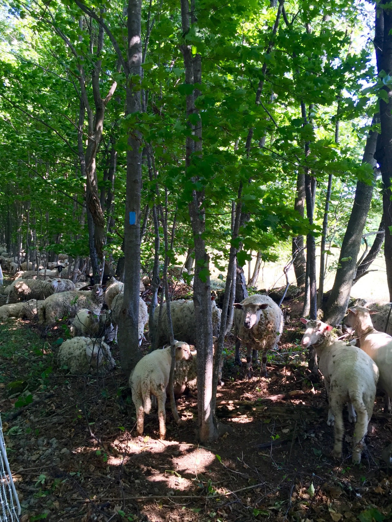 After 5-7 km of road walking, it was back to the lanes and forests for us.  We happened across this herd of sheep enjoying a little shade.  Unfortunately their keepers, two very large golden sheep dogs were not as pleased to see us!