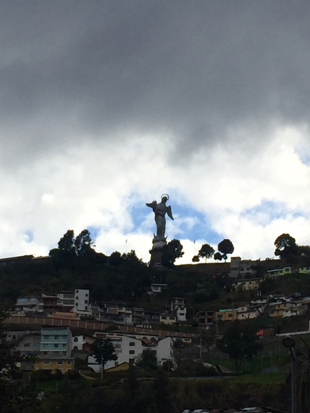 Also on our walk ( by the way it was supposed to rain and thunder today, and while it threatened at times, we lucked out with lovely weather 20C or so), the ever present winged Madonna was watching over us. It is said that she was placed there to wrap the citizens of Quito in her arms and protect them from volcanoes. Not a bad idea since there are 2 or 3 active ones within site of the city!