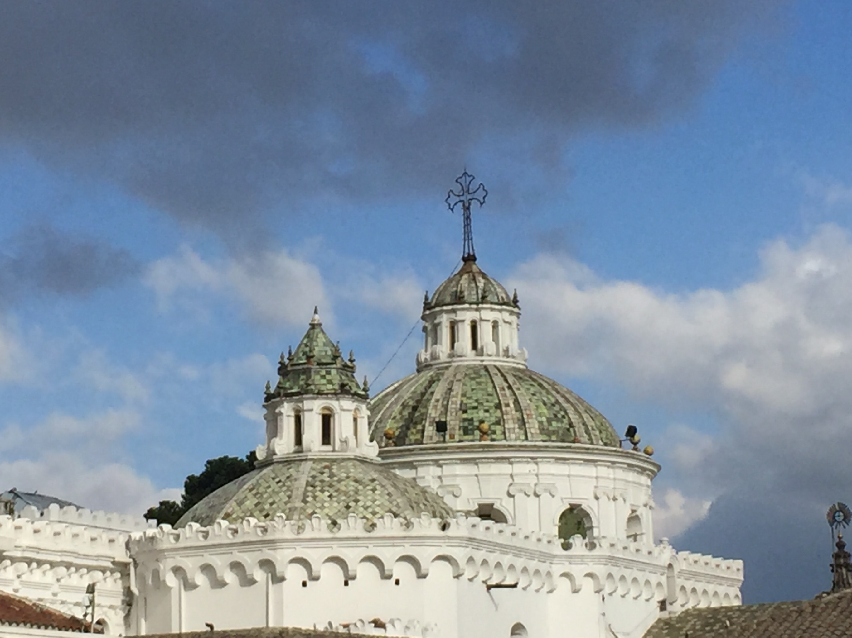 Also on our walk ( by the way it was supposed to rain and thunder today, and while it threatened at times, we lucked out with lovely weather 20C or so), the ever present winged Madonna was watching over us. It is said that she was placed there to wrap the citizens of Quito in her arms and protect them from volcanoes. Not a bad idea since there are 2 or 3 active ones within site of the city!