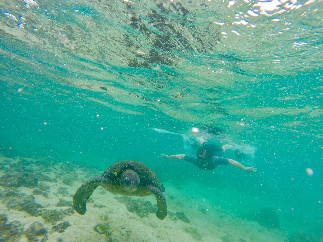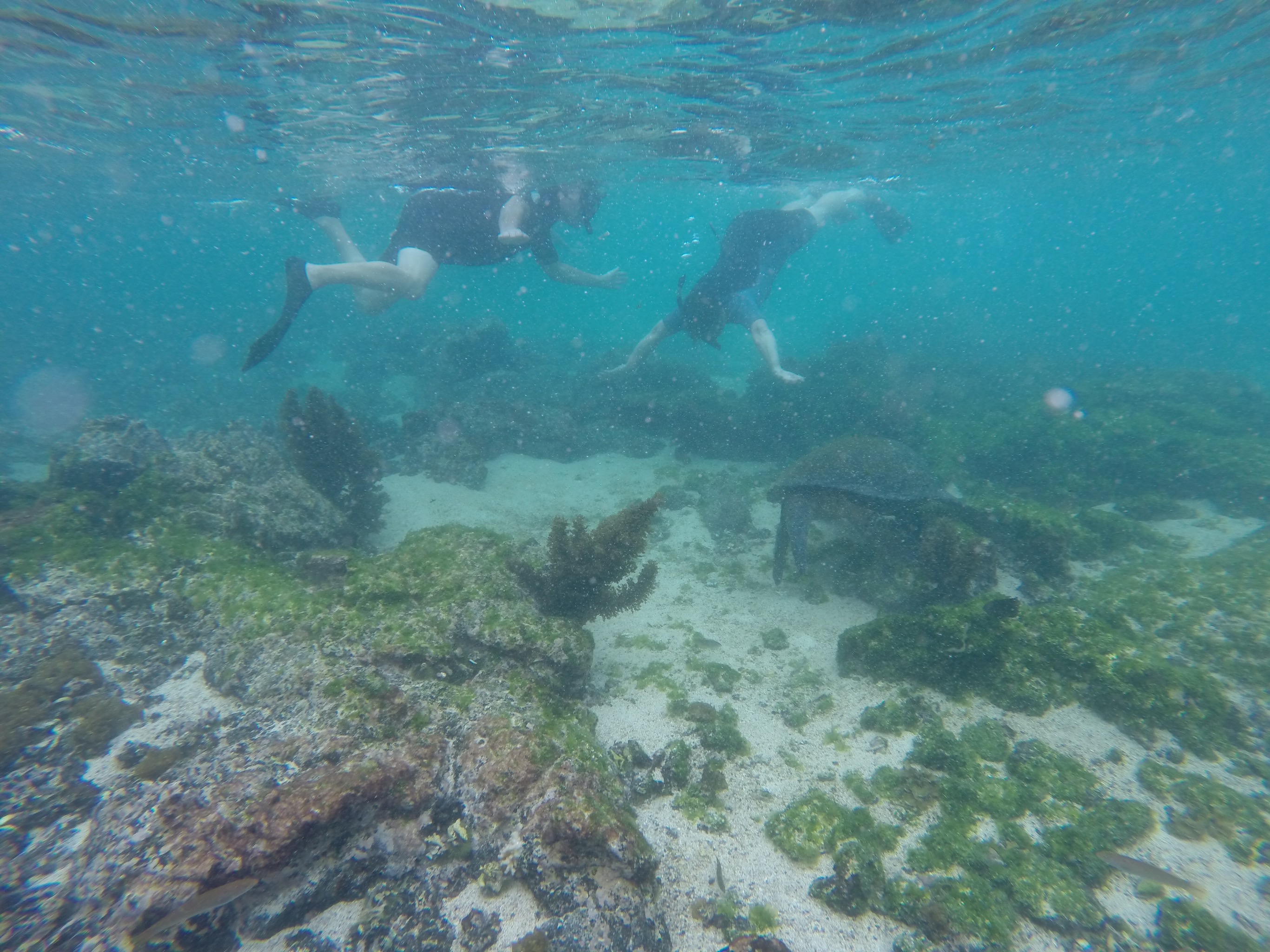 We grabbed our gear and headed down to wharf to pick up a boat that would take us to our snorkelling destination. Another great day for adventure adding sea iguanas and star fish to our playmates along side many sea turtles and sea lions. Just a delight! Here’s a shot of Dan and I swimming with a Sea Tortoise.