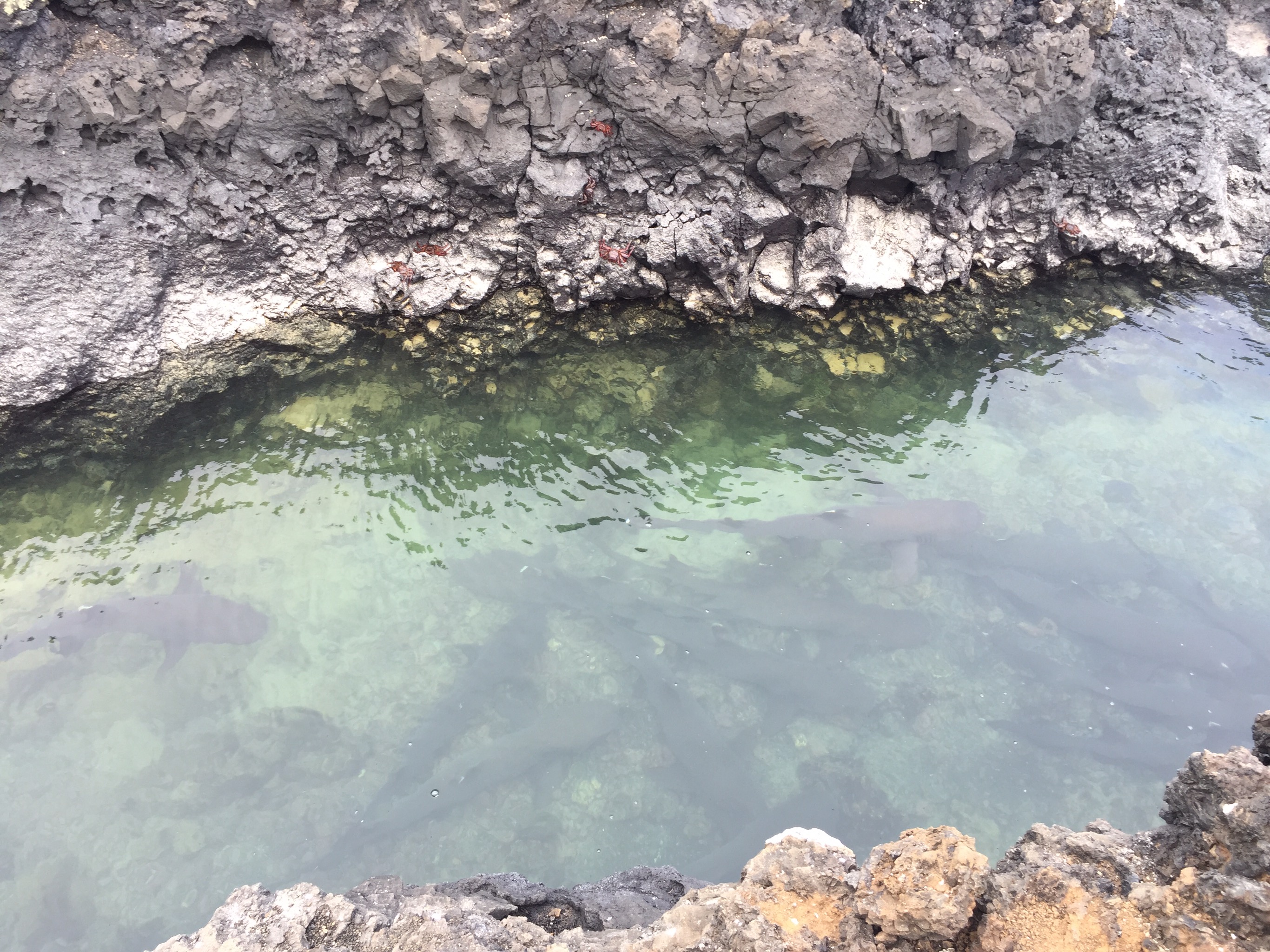 We came across a very narrow channel and saw a “viewing gallery” of white tipped reef sharks lazily floating on the bottom. Apparently they are one of the few sharks that do not have to keep moving when they sleep, they simply lie pretty much on the bottom of the channel and the water running by their gills keeps them alive. Only today they had a playful sea lion that kept teasing them and wouldn’t let them sleep! No signs of violence though!!