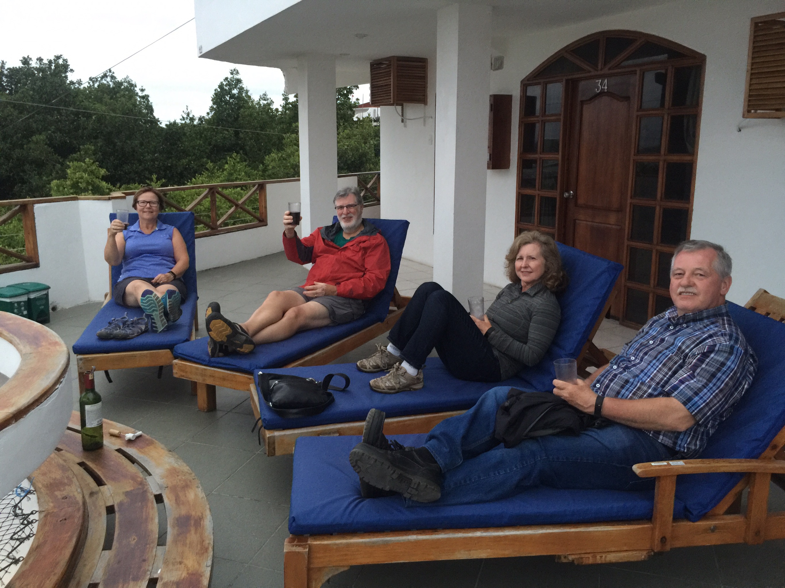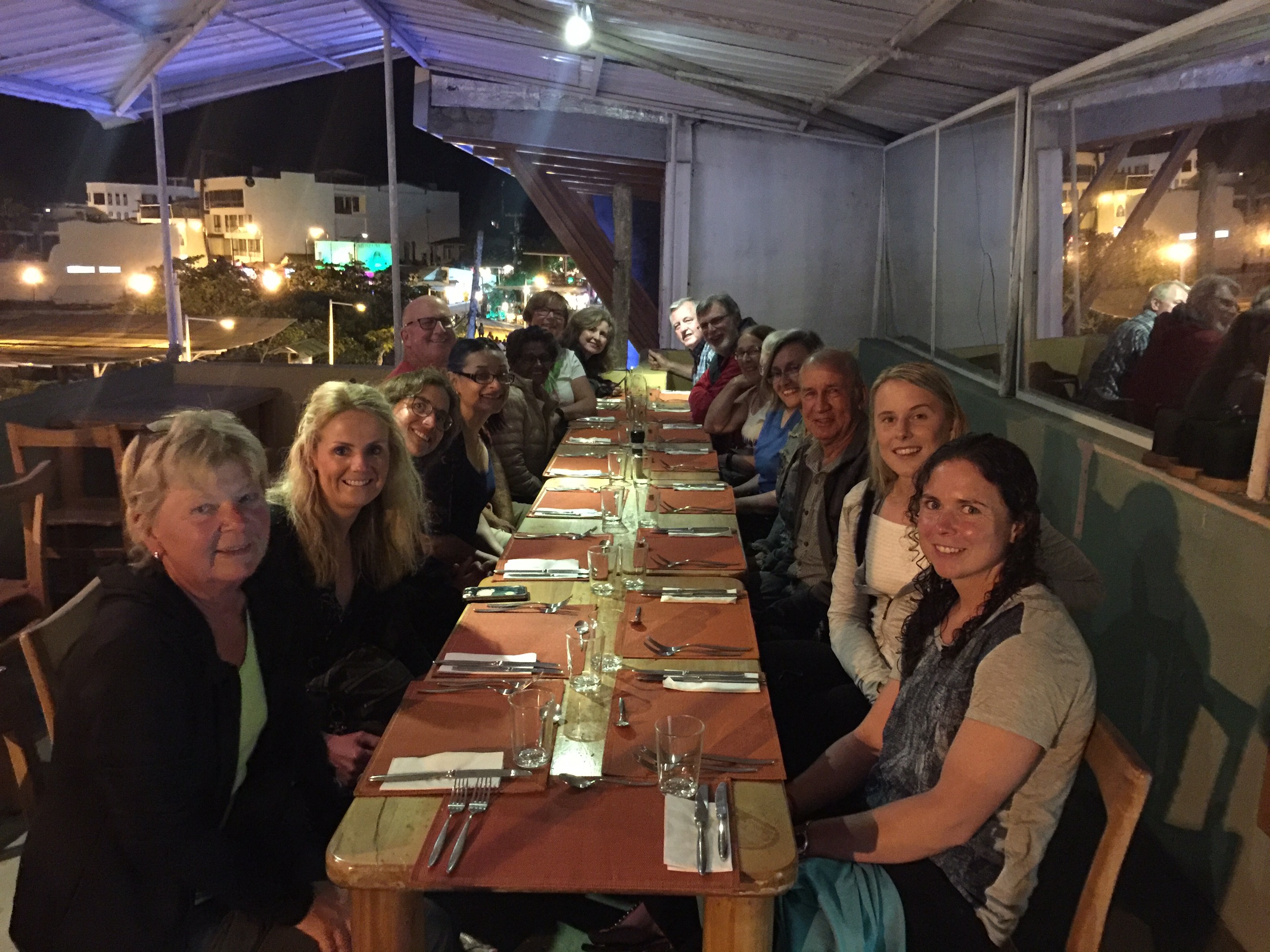 Our excursion at 4 was more successful. We met the guys having a cerveza and soon headed back to the hotel. Glenn had bought a bottle of wine for our last night, and we enjoyed it on the patio adjoining our room. Then off to dinner with our “Family” for one last group meal together before we leave the Galapagos and our wonderful guide Wilson!