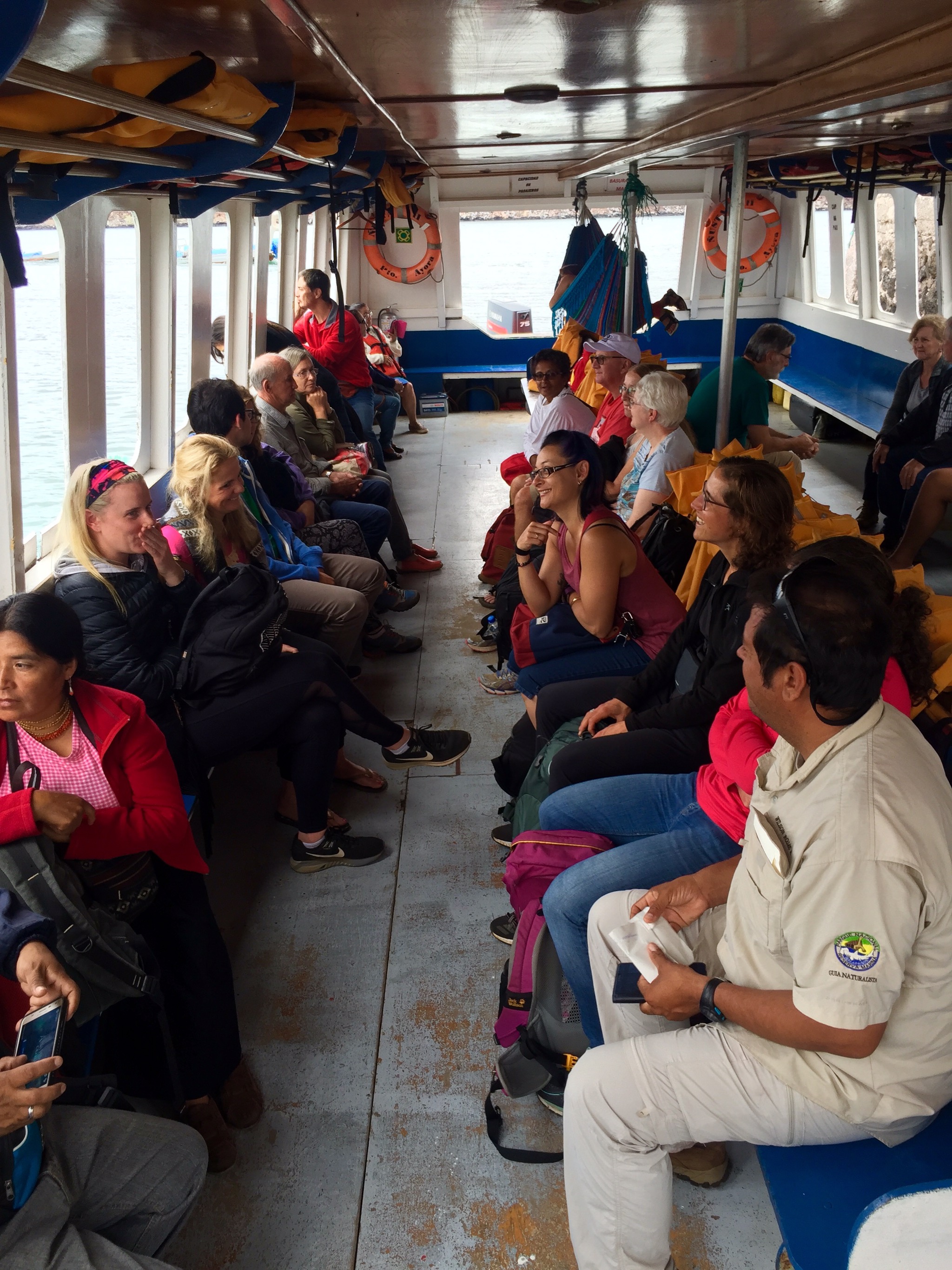 While the luggage stayed on the roof, we all went to the lower deck and sat on a bench, donned our life jackets and waited for our departure. Well, all but one of us sat on a bench…she was lucky and was able to stretch on a hammock that was stung down the centre!