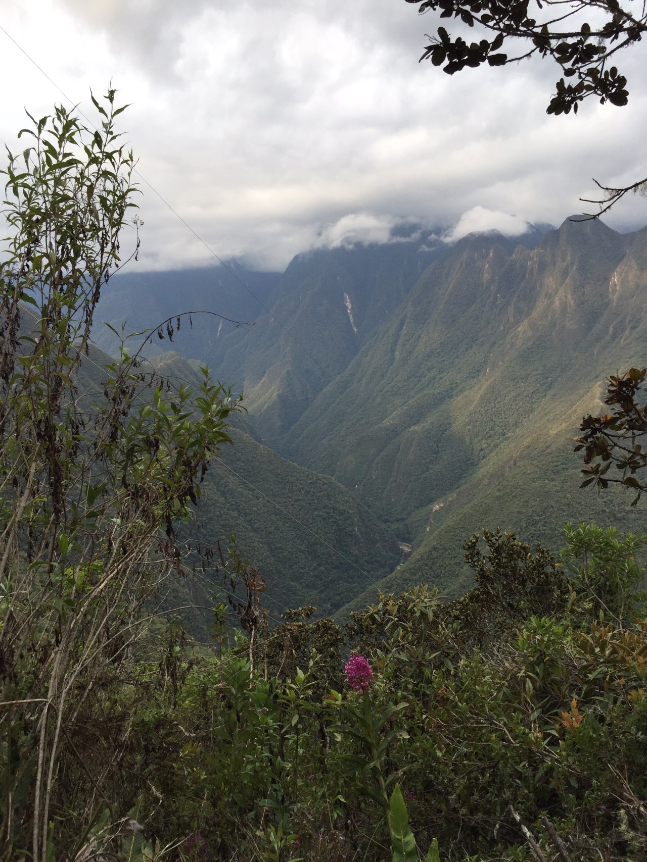 We walked through this site…yes up those long stairs on the left, only to go down even steeper stairs to the north ( hidden). It was a bit of a maze, and I got separated from the group for a while. So I started looking for flowers and other things of beauty, and what did I spot but a Winayhuayna orchid stretching up in supreme beauty against the backdrop of the Andes!
