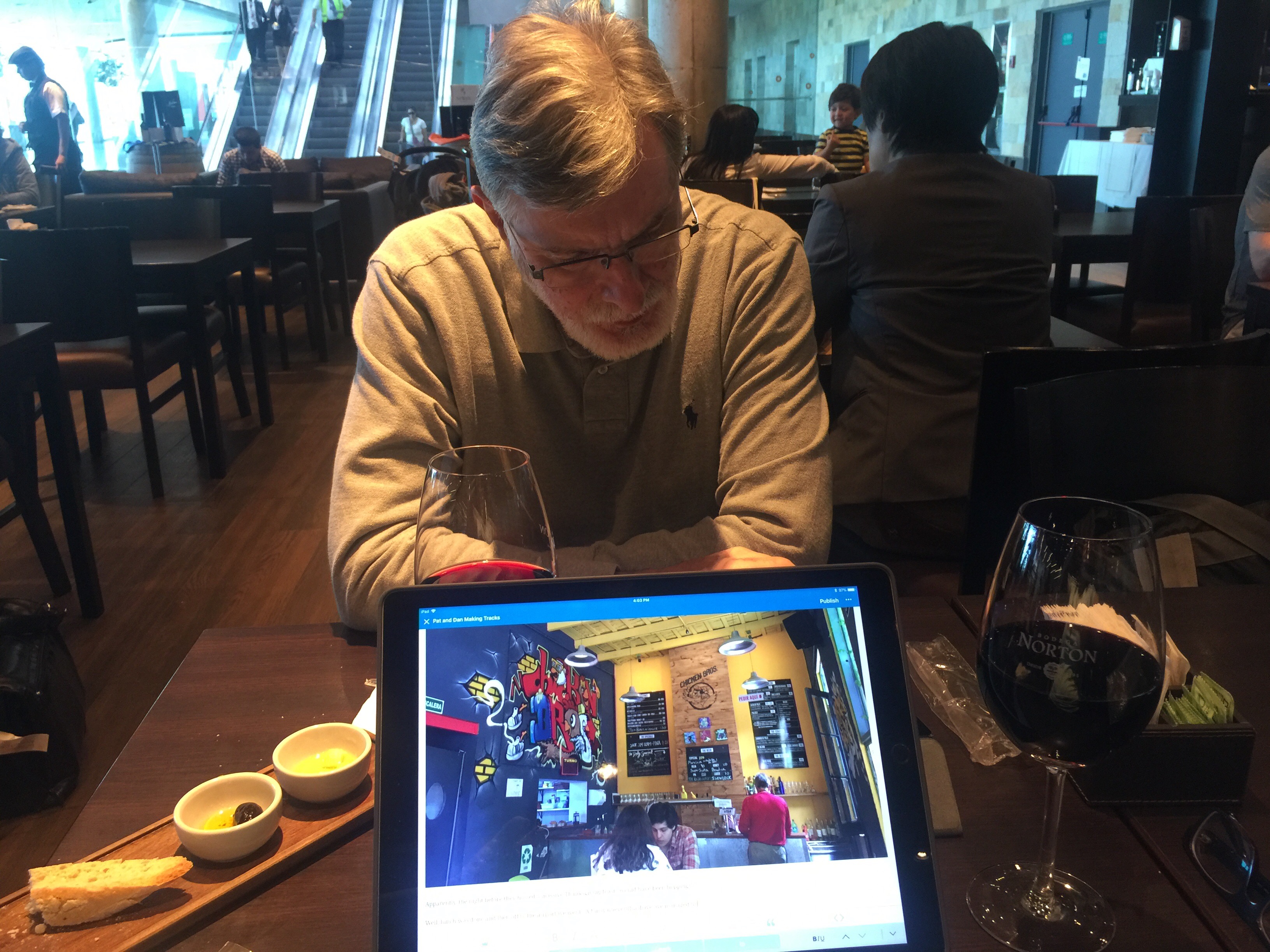 Well, lunch was done and then off to the airport we went. A fairly uneventful drive, we managed to get checked in and through to a lovely wine bar to celebrate our trip. One last glass of “domestic” Malbec…..mmmm delicious! Coupled with fabulous wifi, I can actually publish this page before we get home!!