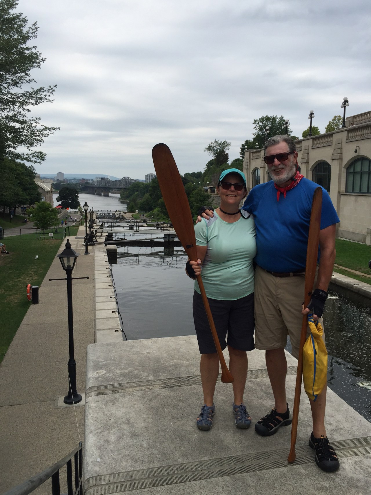 We paddled right up to the paddling dock under Wellington St and got out to taste a few final pics of our journey! When we asked the Parks Canada lock worker to take our picture, she said, “Oh, I know the best spot, follow me!” In the back ground you can see the “8” locks of the Ottawa station that transfers boats down into the Ottawa river. Very Cool!