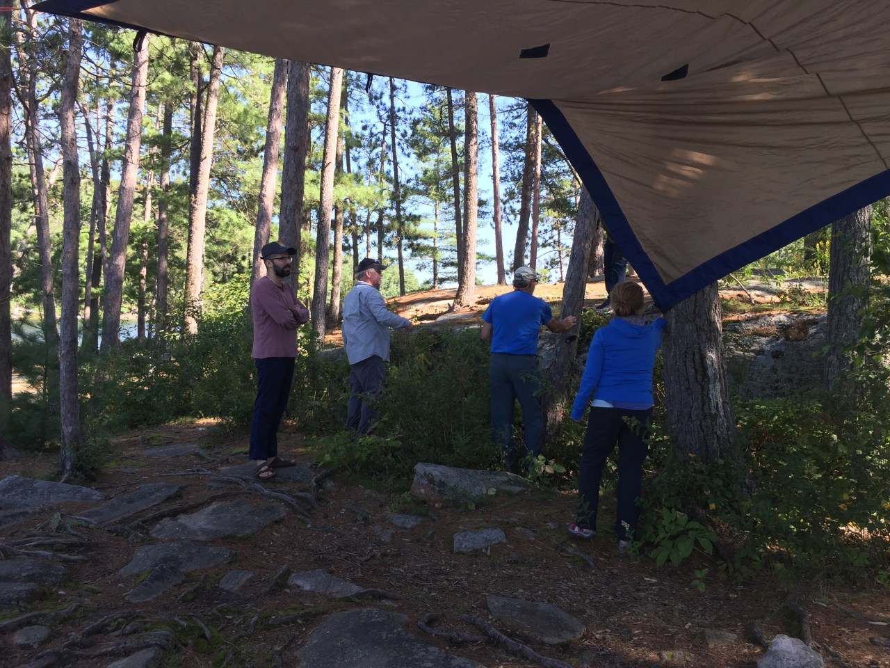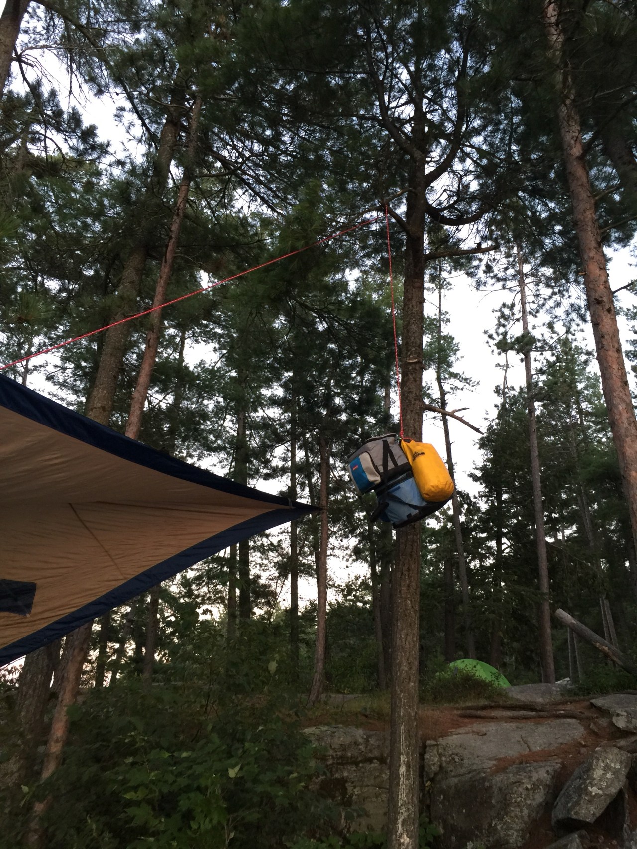 Once everyone gathered at the site it was time to get set up. Everyone explored tent locations and each couple got their tent set up. The next step after lunch was to get the ancillary stuff set up. Glenn brought a large tarp that could serve as weather protection (yes, there was rain and thunderstorms in our forecast). We also had to get the food pack line up as well as the hammocks. This site had loads of trees, perfect for our lightweight nylon hammocks!