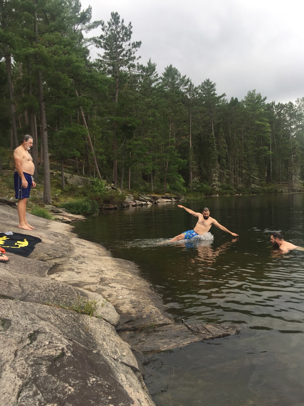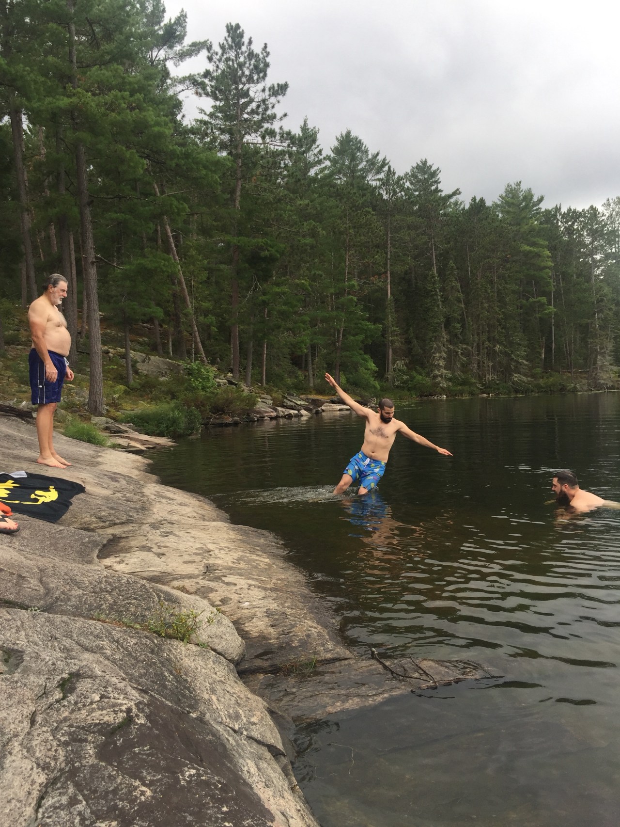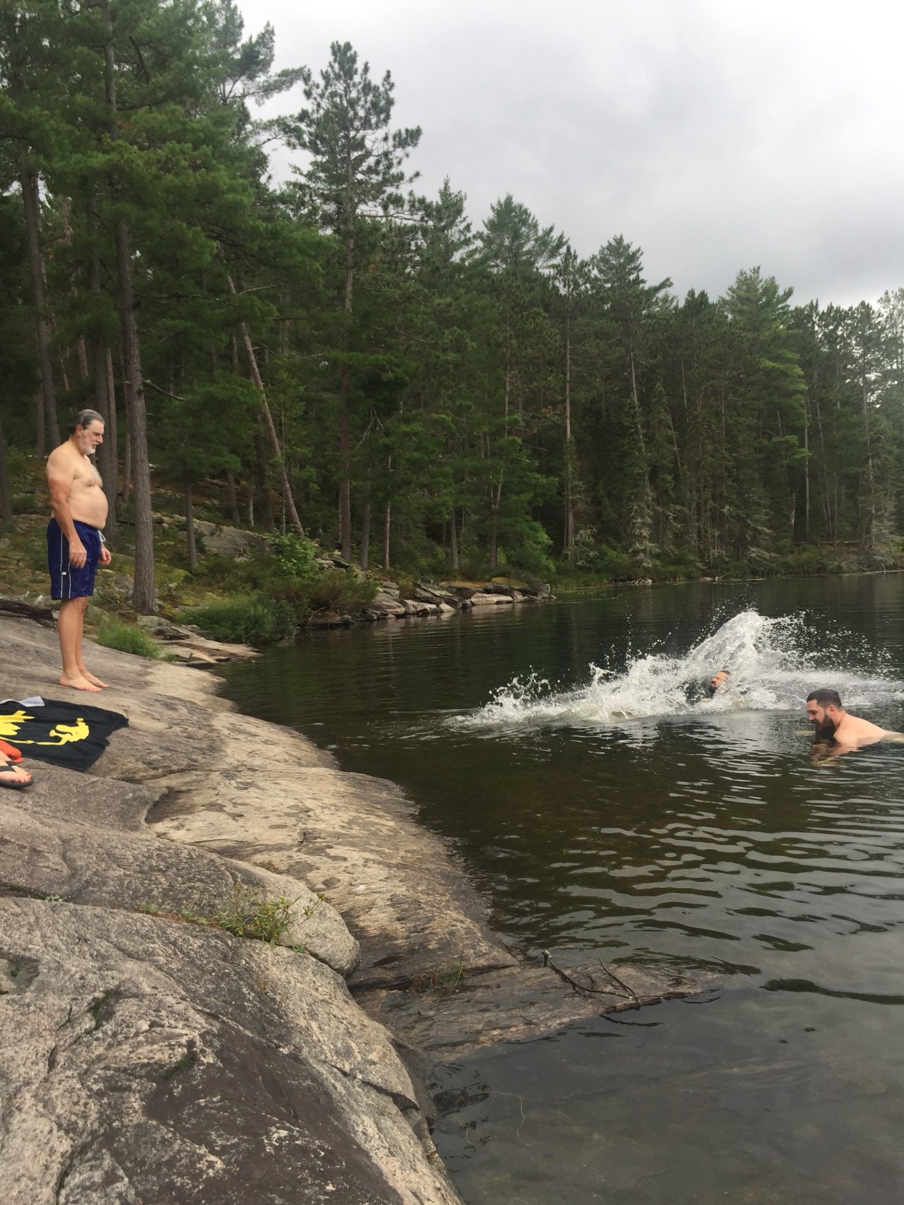 When the rain stopped we decided to go for a swim and there was even an opportunity for Pete to demonstrate the side slide that Dan tried to do getting into the canoe the previous day!