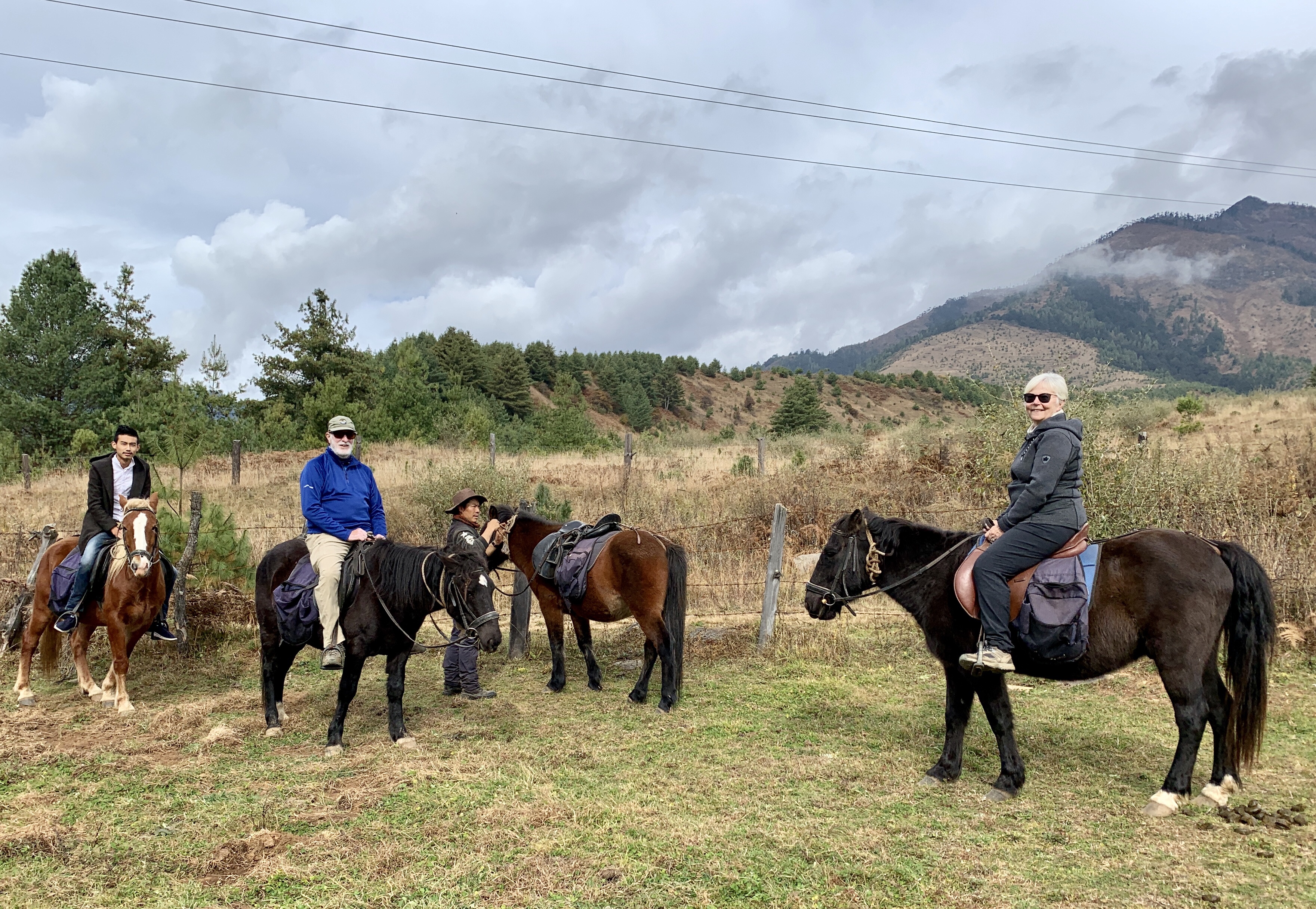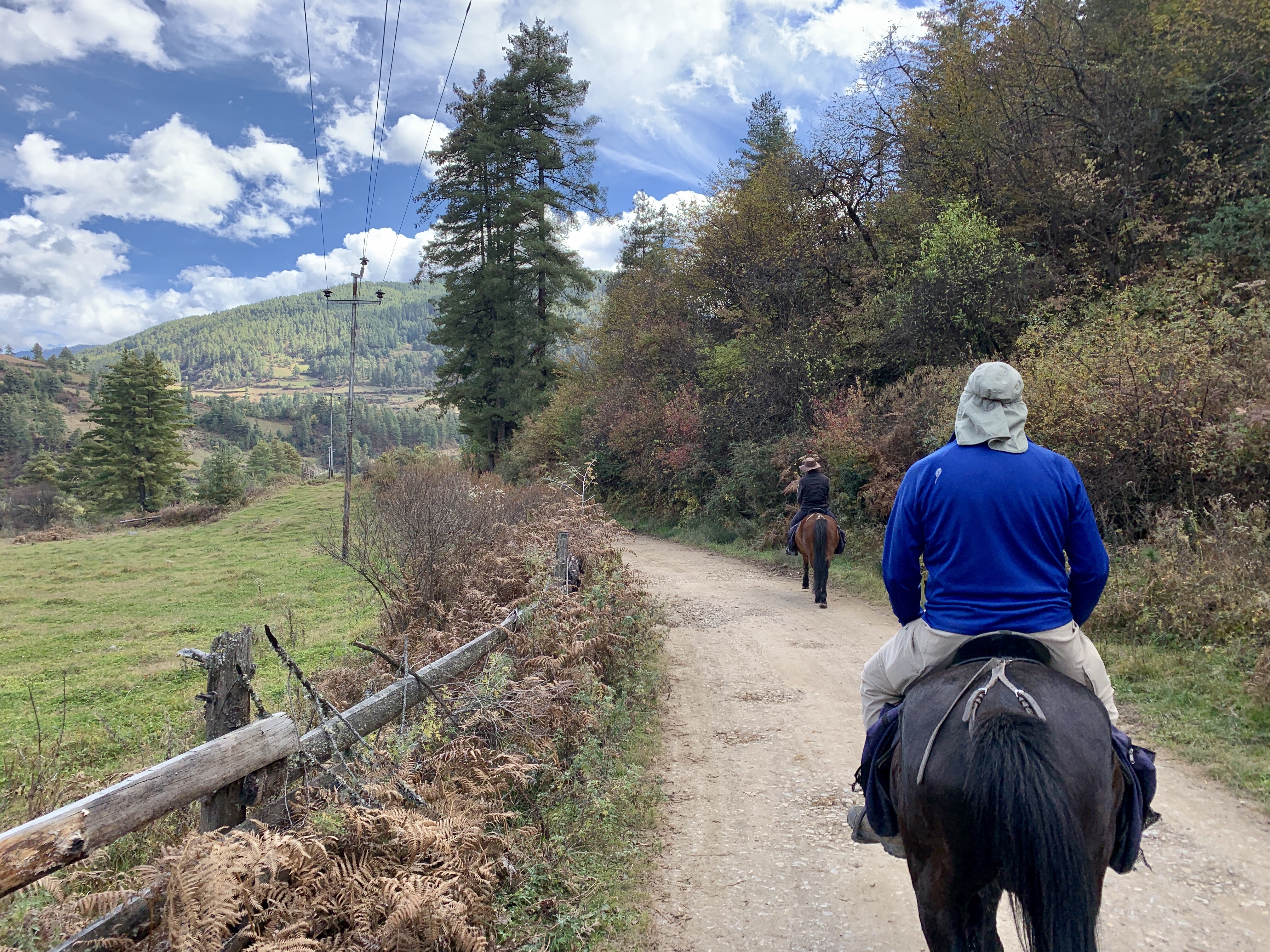 When we made it back to the farm after 2 hours or so, our driver Penjor dismounted as he had to take the car to our next stop. Kenchu had been walking, and joined Penjor in the car while we headed off for our lunch spot by the river on horse.
