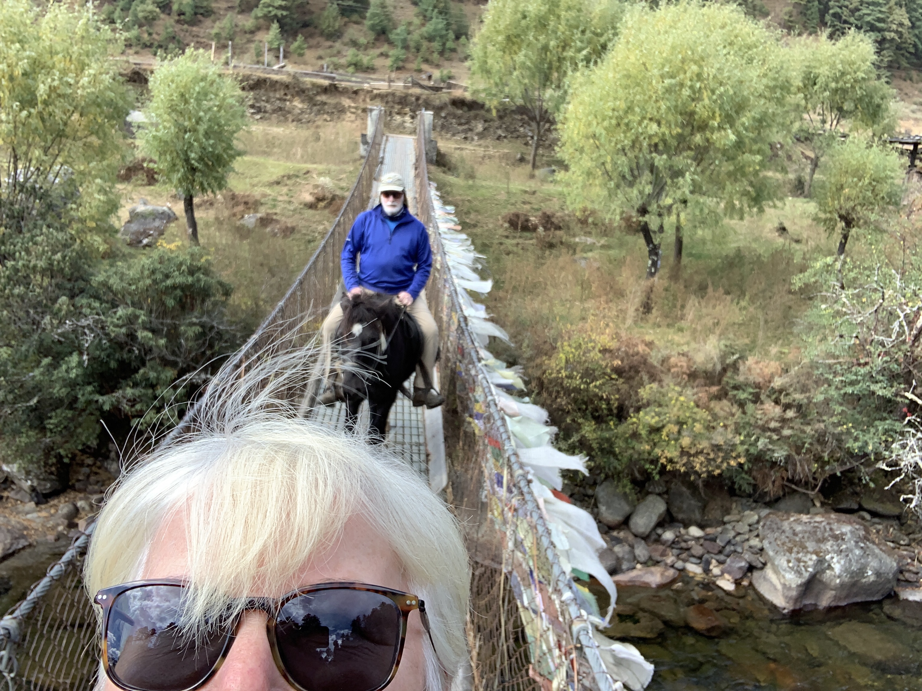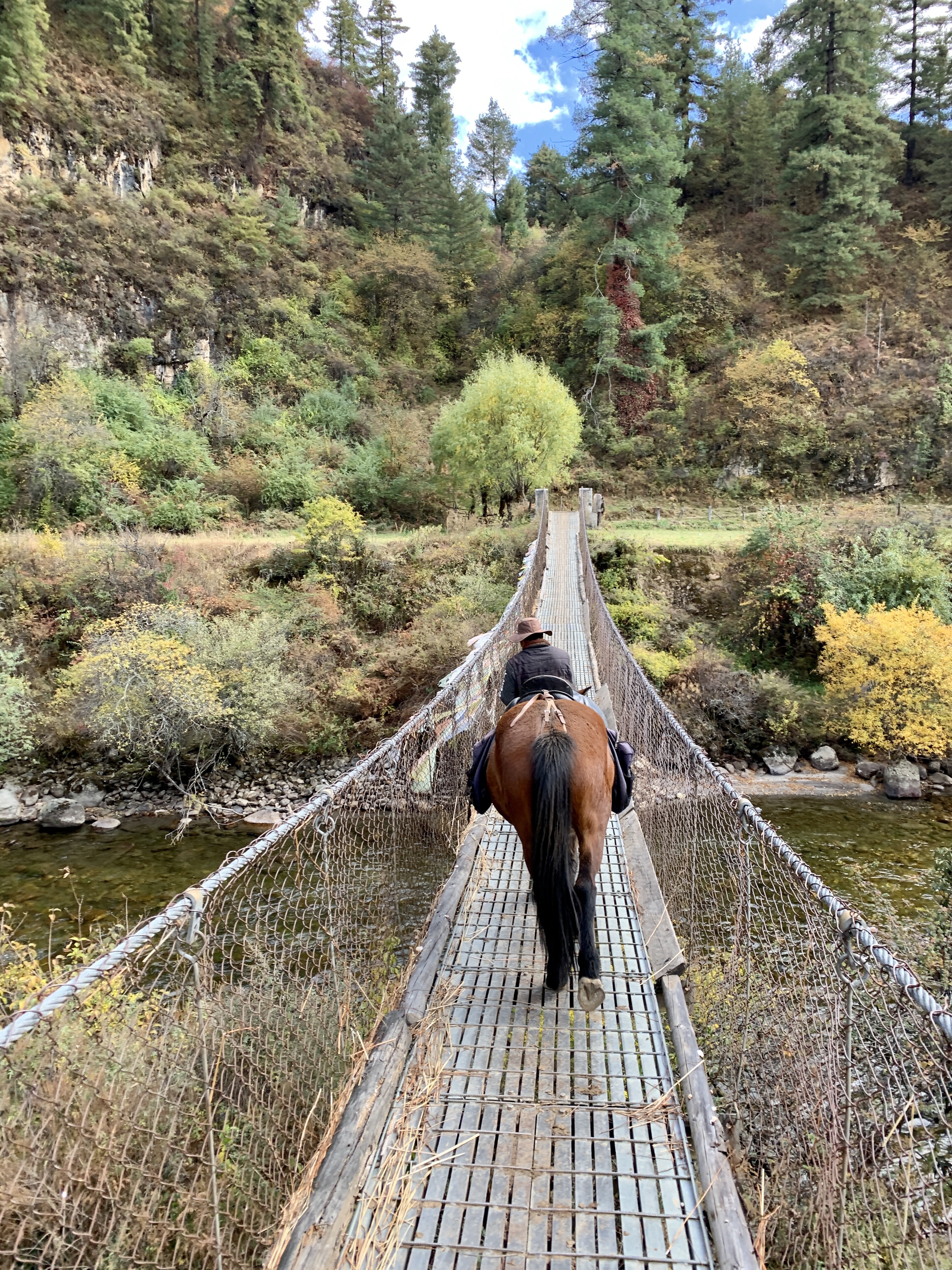 We continued down to the valley floor and soon came to a suspension bridge crossing the river. Pema dismounted as his horse was a little sceptical of the crossing, but as he led his horse across the other 2 followed beautifully.