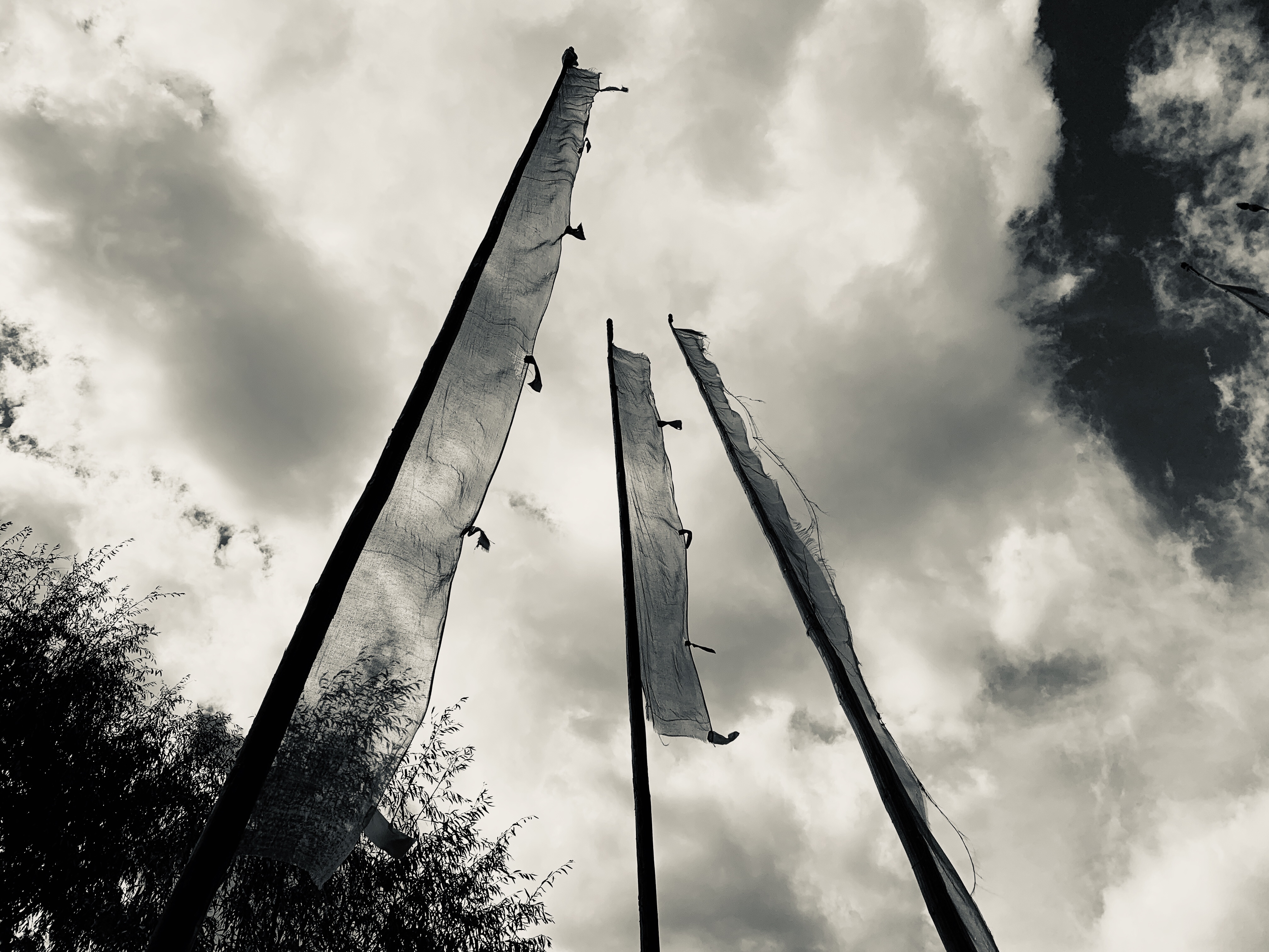 Just on the other side of the river Kenchu and Penjor had set up a lovely lunch spot in the shadow of a Chorten and some very weathered prayer flags. There was a farmers field with cattle grazing, so Pema took the bits out of the horses mouths and let them graze while we had lunch.