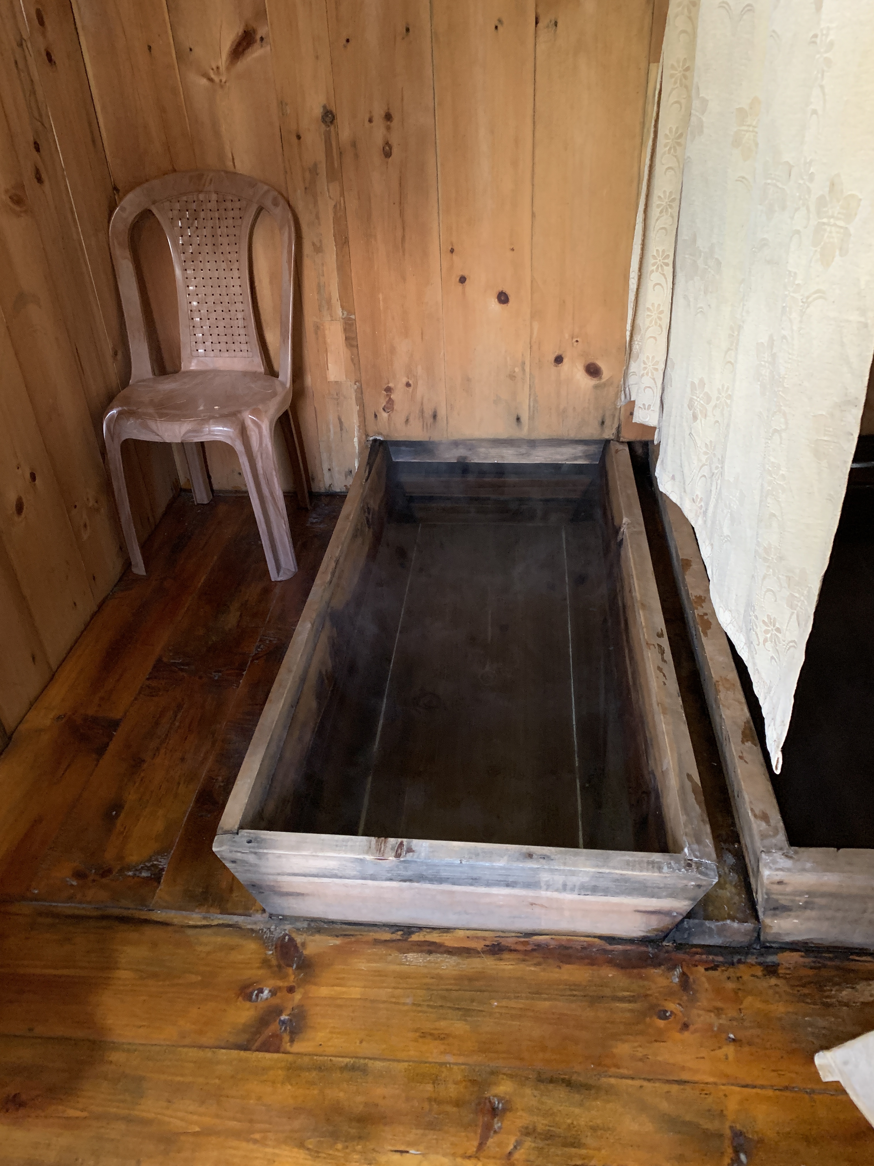 When we entered the “bath” room there were two long wooden tubs, steaming with the warmed water. The tubs actually protruded through a wooden wall, but wooden slats at the wall added a sort of baffle to our tubs. This way, our host could add additional hot stones as the water cooled off, and not interrupt our privacy. A great system, and I’m discovering that the Bhutanese like their baths like they like their chillis – HOT! Dan and i cooked for about an hour and a quarter, intermittently getting out when we got way too hot. We even had the stamina to have them add an extra stone each near the end.
