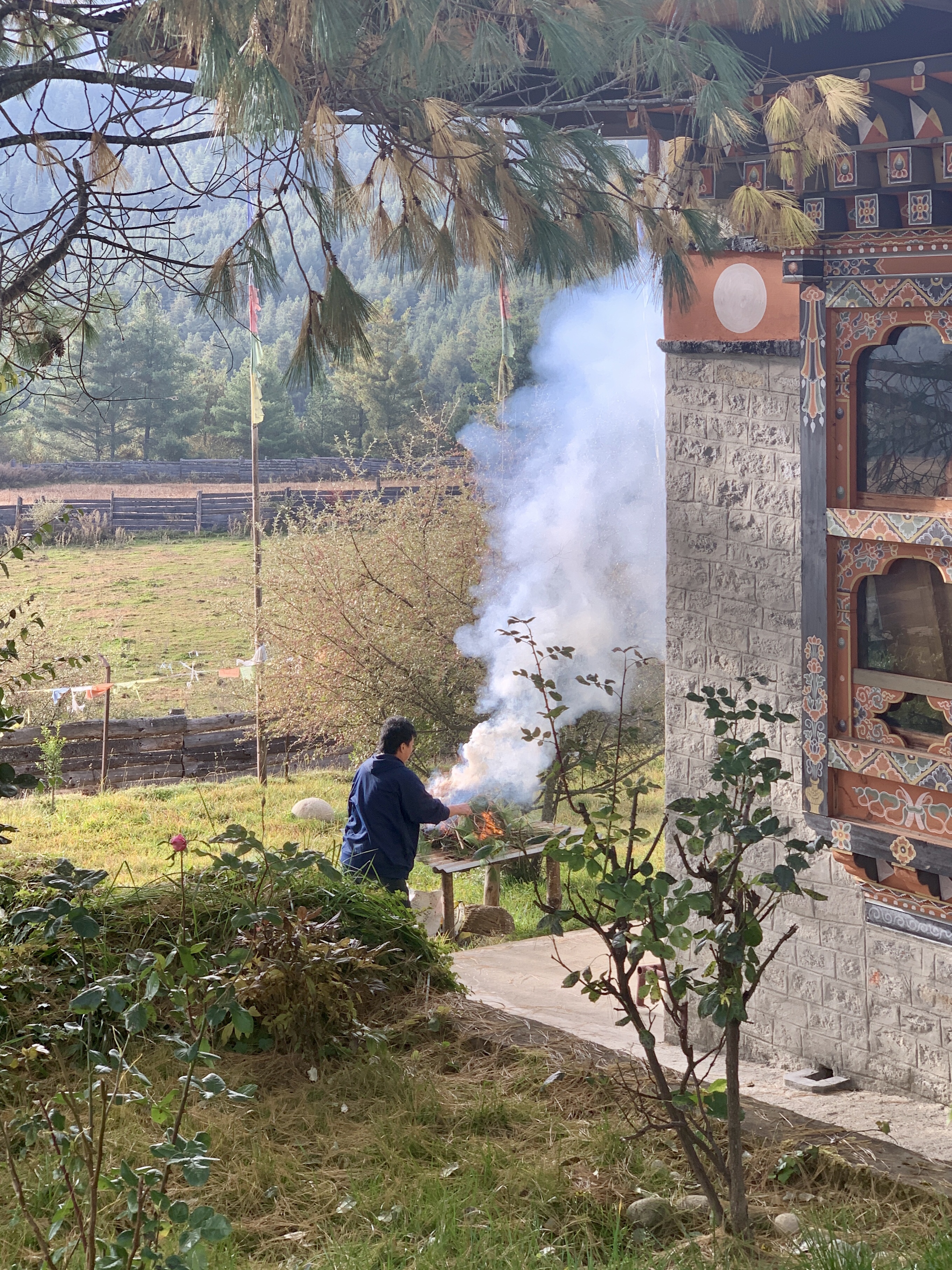 Our day began with the light chiming of bells followed by ceremonial oboe like instruments hailing a call to prayers in the meditation building of the hotel. Outside the building we could see a fair amount of smoke as they burned the ceremonial incense and pine boughs.