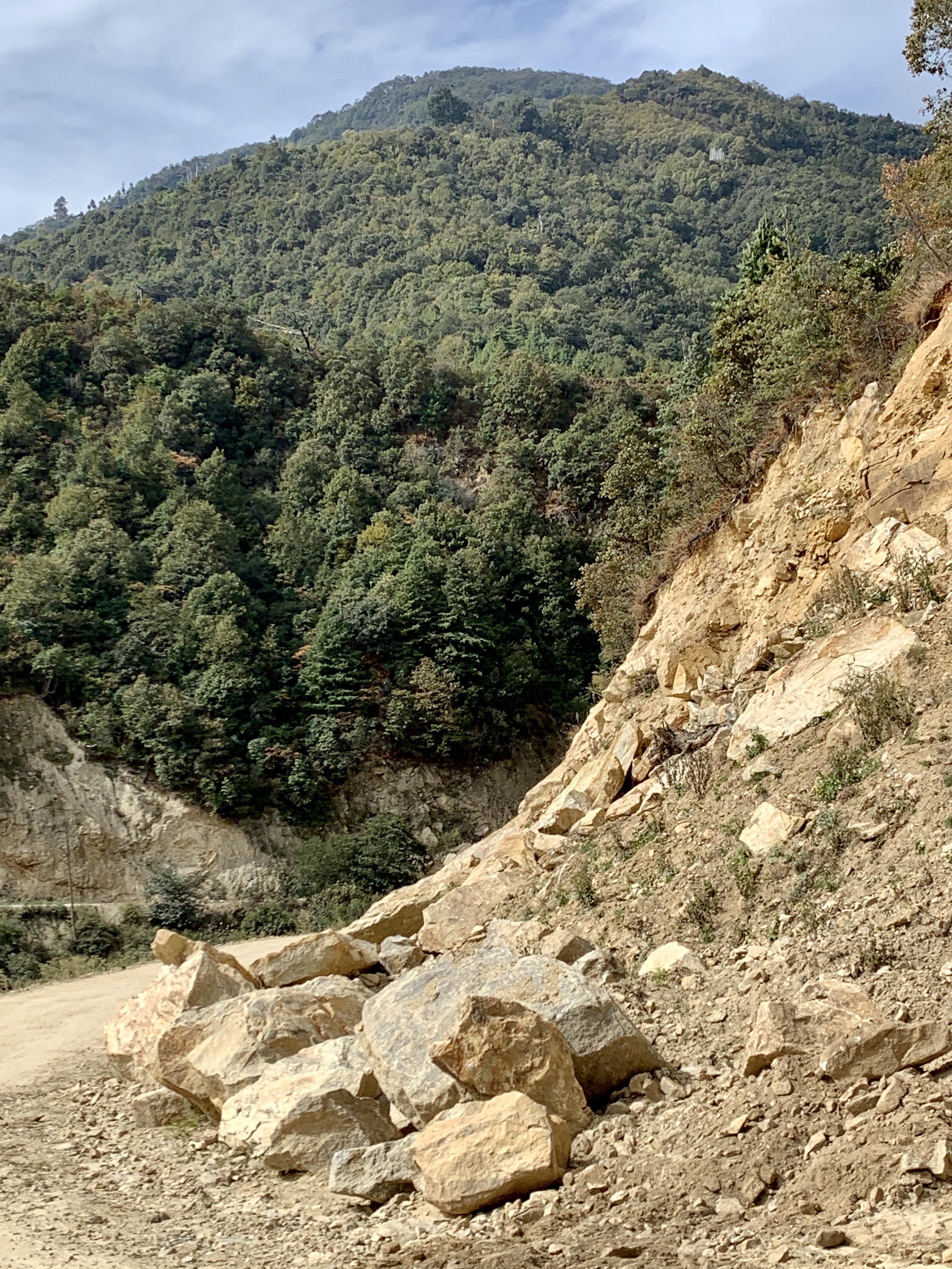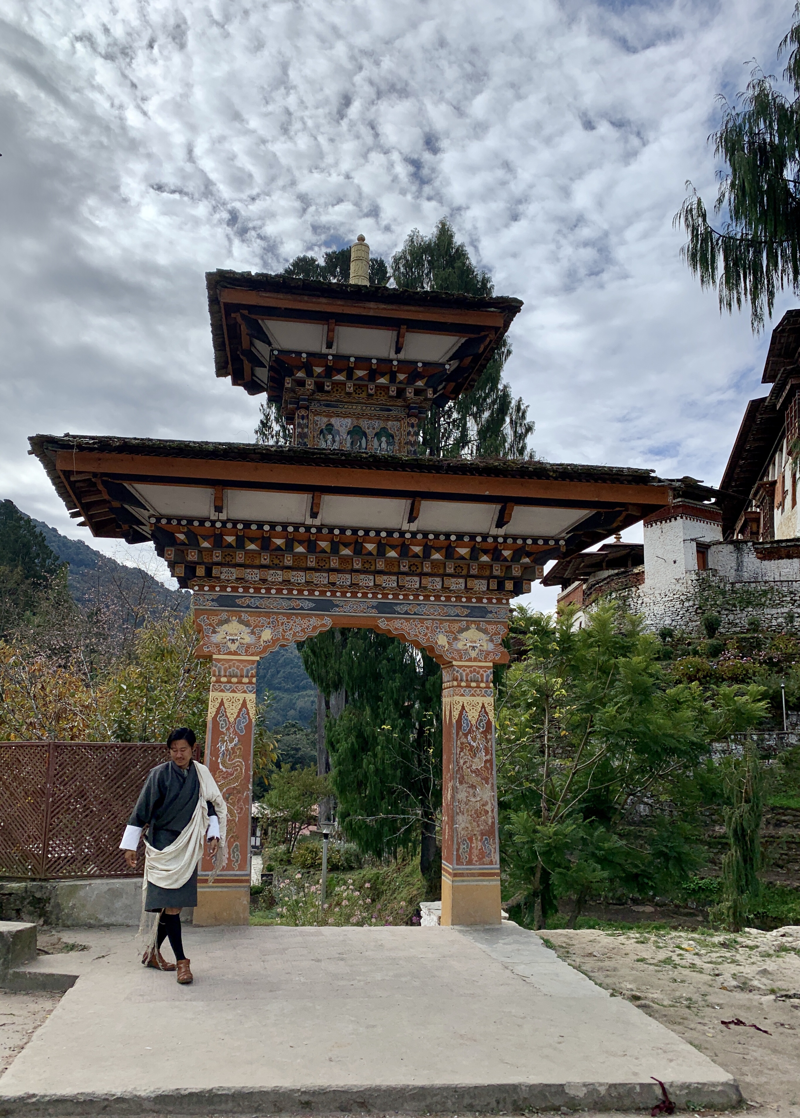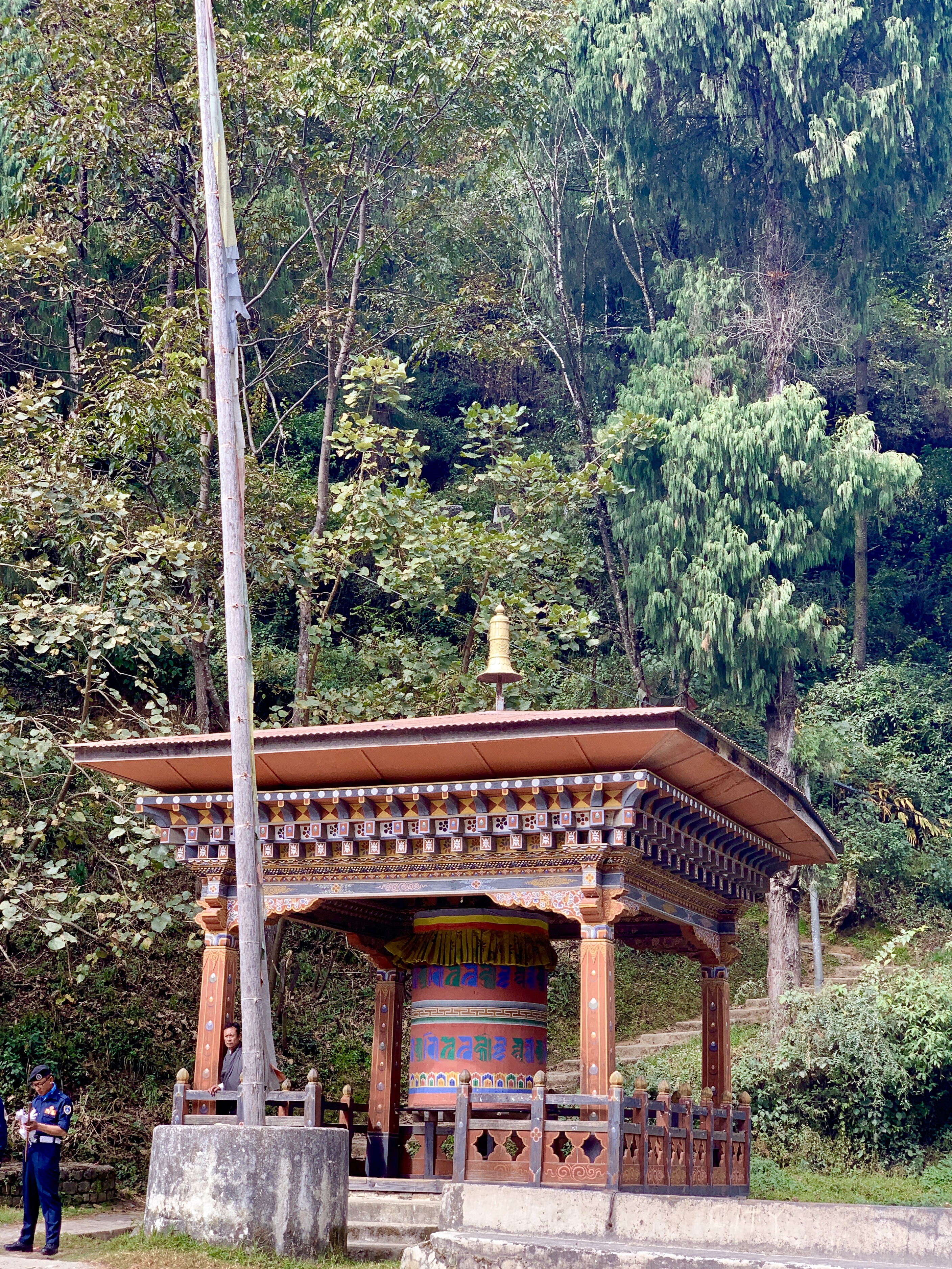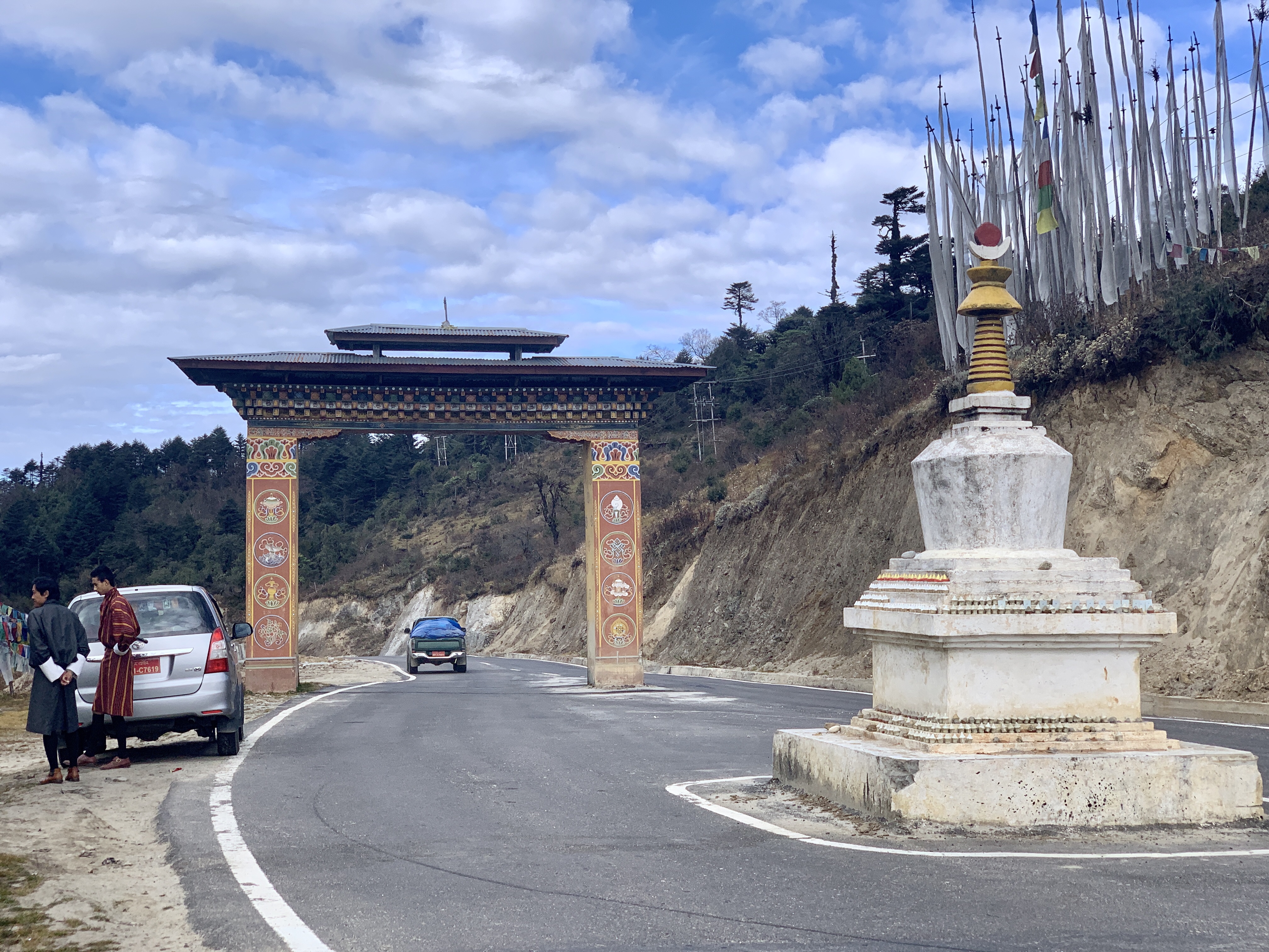 As we headed out of the Chumme Valley, we said goodbye to the and headed for the Trongsa Valley. When we got to the pass, we stopped for a look around and some pictures, and low and behold who should arrive, but one of the groups from our Tang Homestay. The bus slowed down and the guide handed Dan’s hiking poles to Kencho as they continued on their way. We believe they were heading to Punaka today and had a very long drive ahead of them! What a blessing that was!!