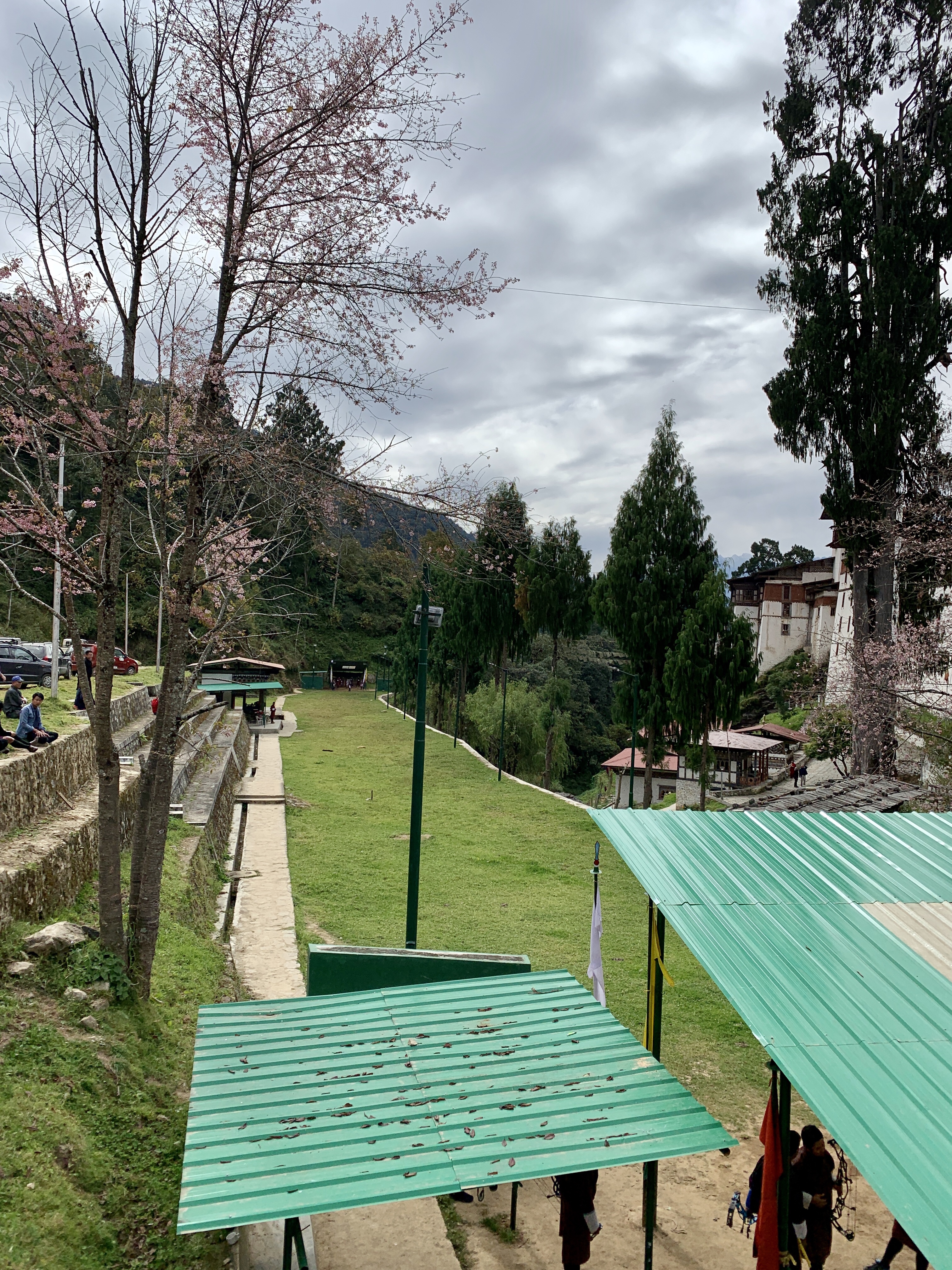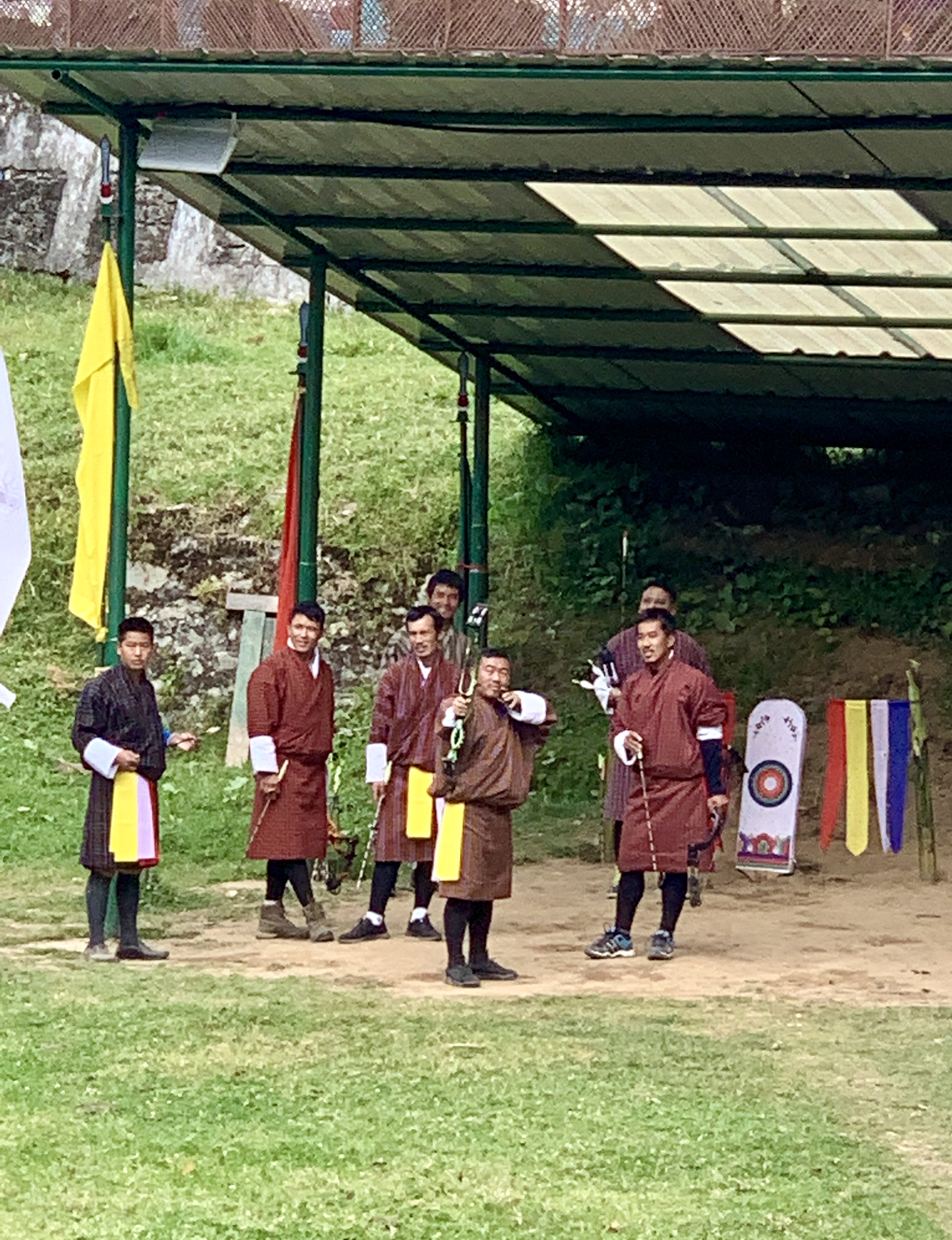 As we left the Dzong, a number of administrators were having a friendly ( questionable) game of archery. These targets are minute when looking at them over a 150 meter distance. The largest circle would be about 20 cm in diameter! Lots of fun. Especially when an archer would hit the target…his team at both ends would sing a song as a bit of a hazing to the opposing side!