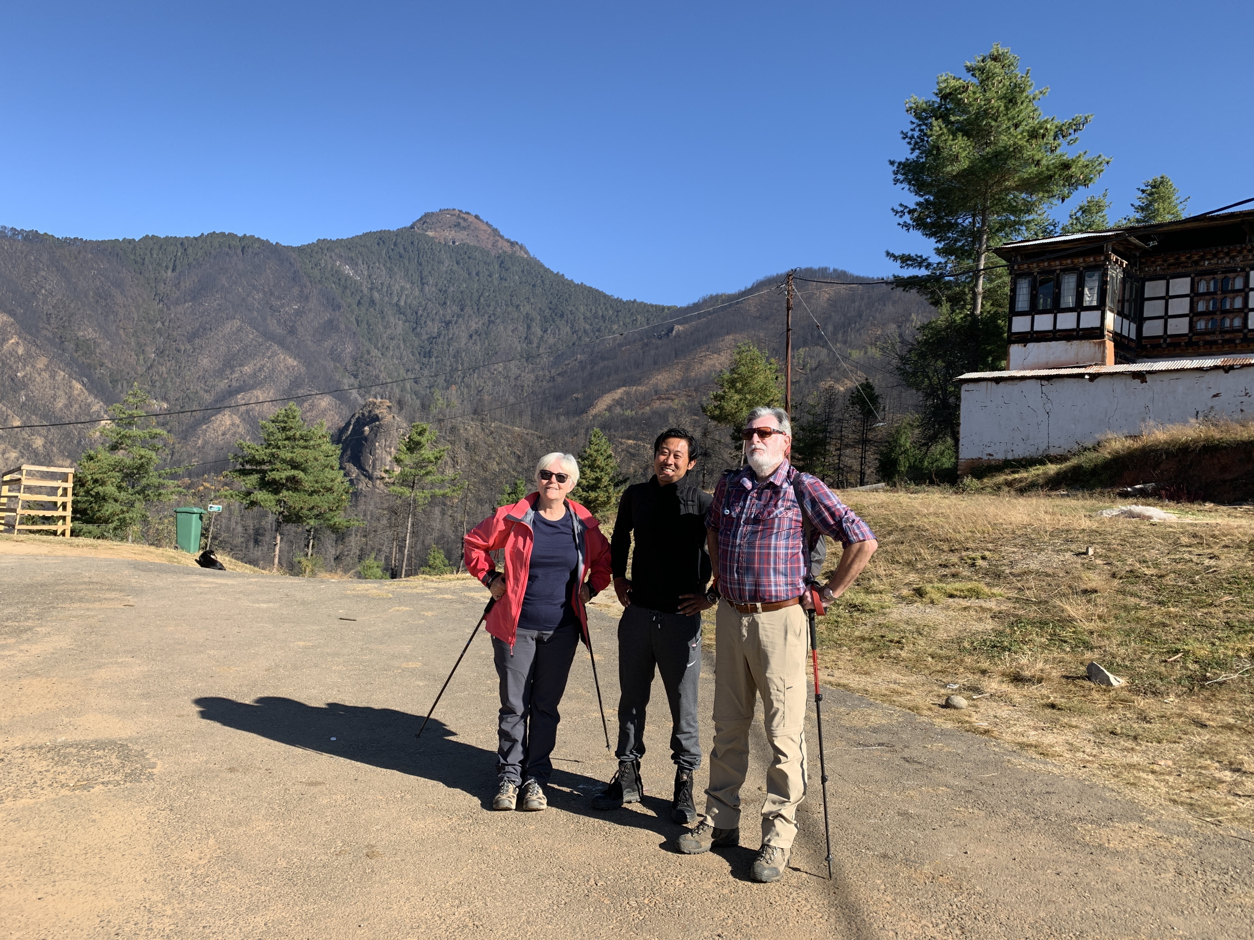Penjor and Kenchu met us at the hotel at 8:30. We left most of our luggage there as we would be coming back tomorrow for our last night in Bhutan! Penjor drove us to Sang Choekor Lhakhang, a Bhuddist monastic learning centre and temple, high above the valley at around 3200M. It was here that we were to begin our hike. Our climb today is an additional 750M, over a distance of about 8 km.