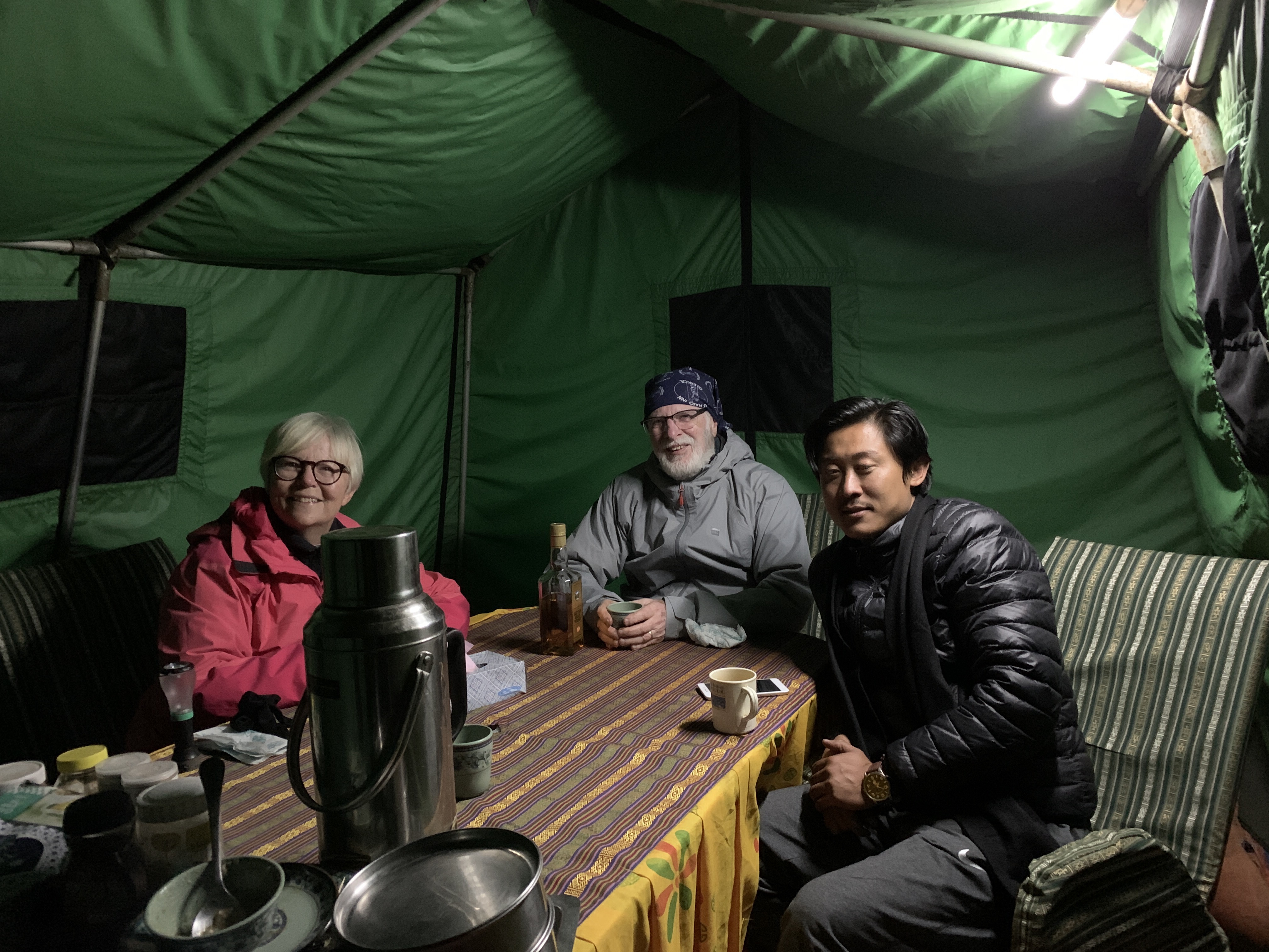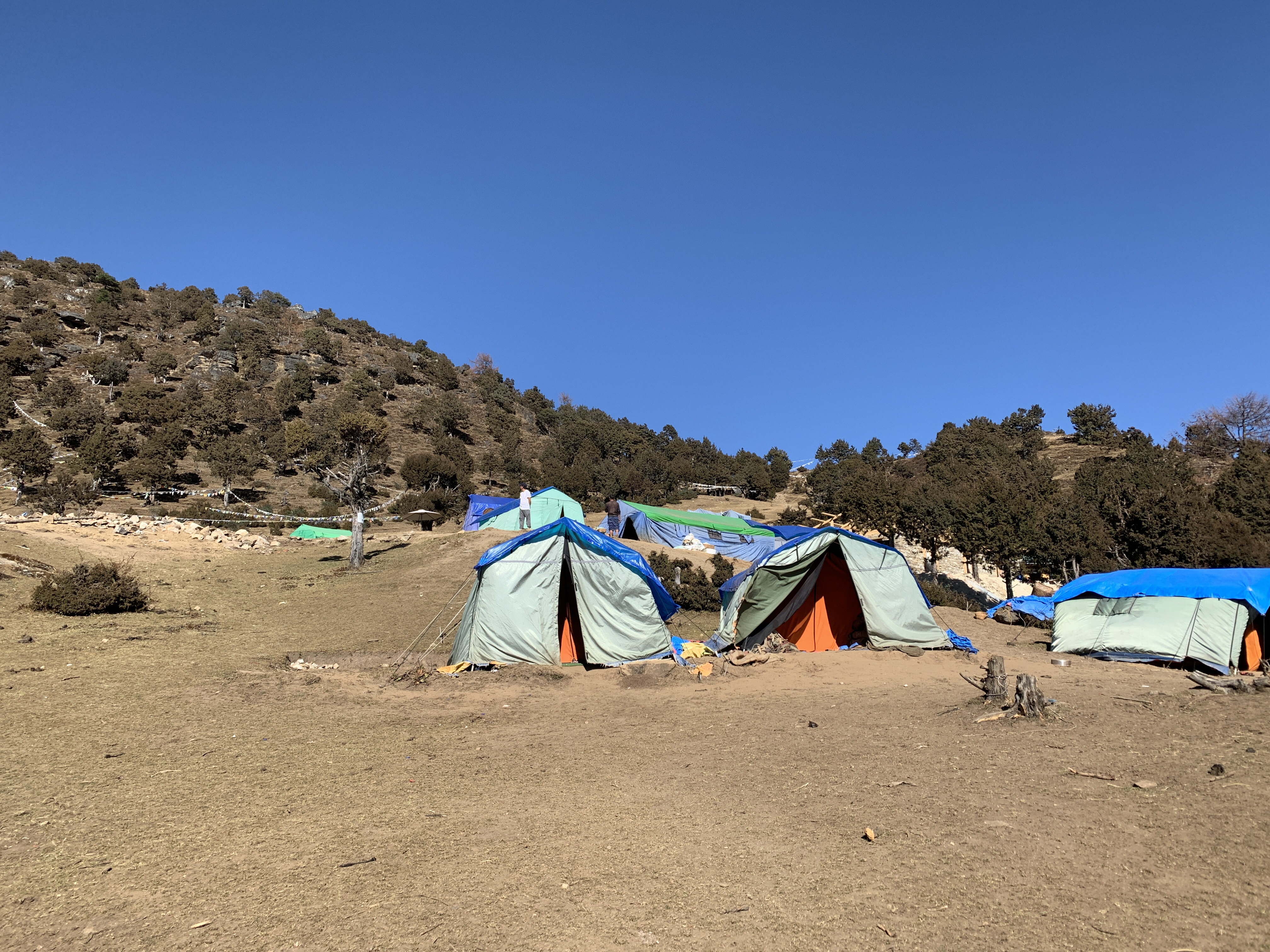 More up and down and we finally came to a meadow where we could see the tents of the camp for the night. Another 10 minutes and we were there. We were shown to some lovely deck chairs under an umbrella. A table appeared and then hot ginger tea and biscuits were served! A little different camping experience from our normal practice!