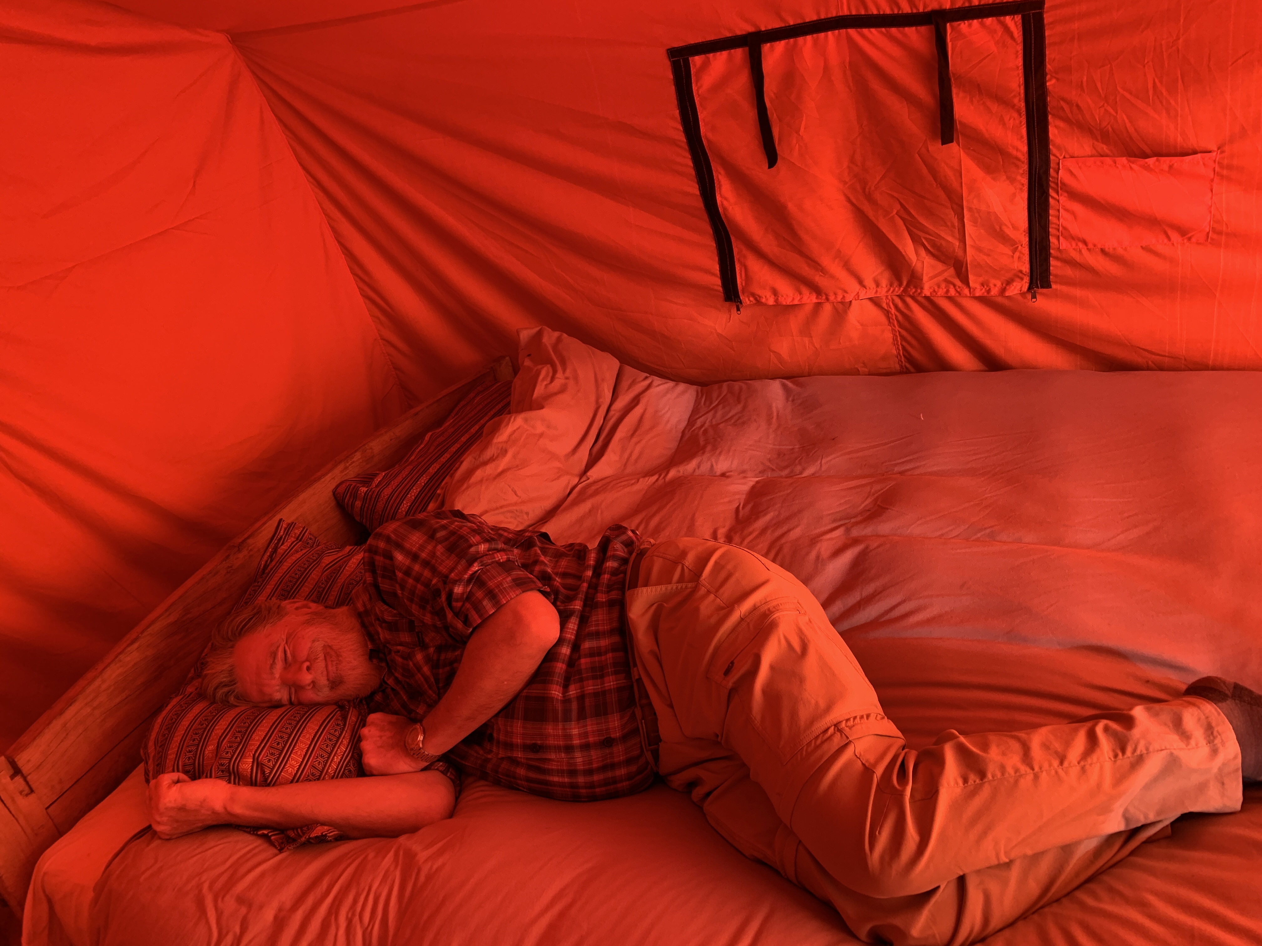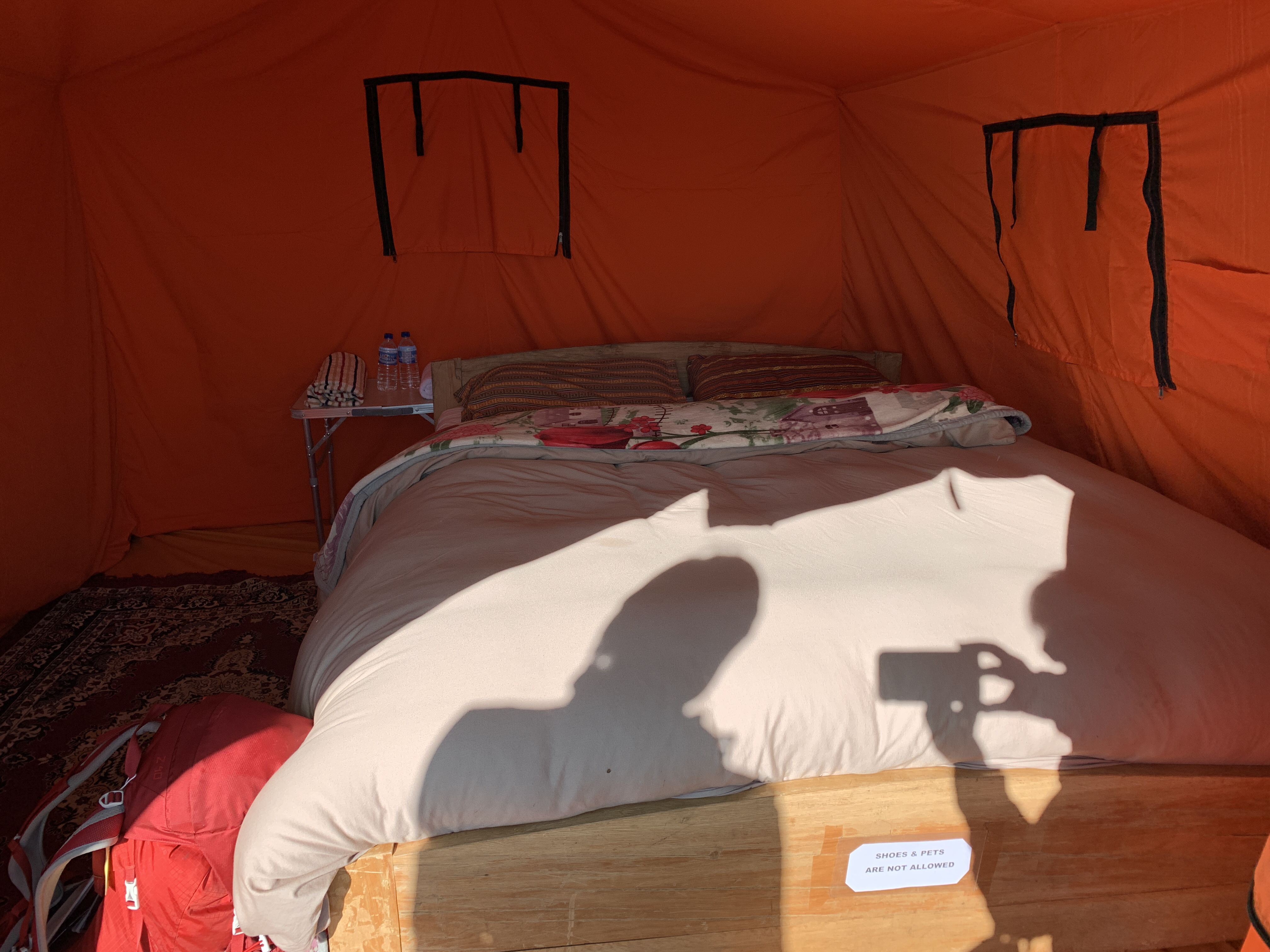 Once we had a good rest and felt refreshed, we headed off to see our tent! A huge tent with standing room and full vestibule, a double bed on a full bed frame with a night stand and a beautiful wool carpet beside the bed. More like a hotel than a camping experience, but we’ll take it!!!