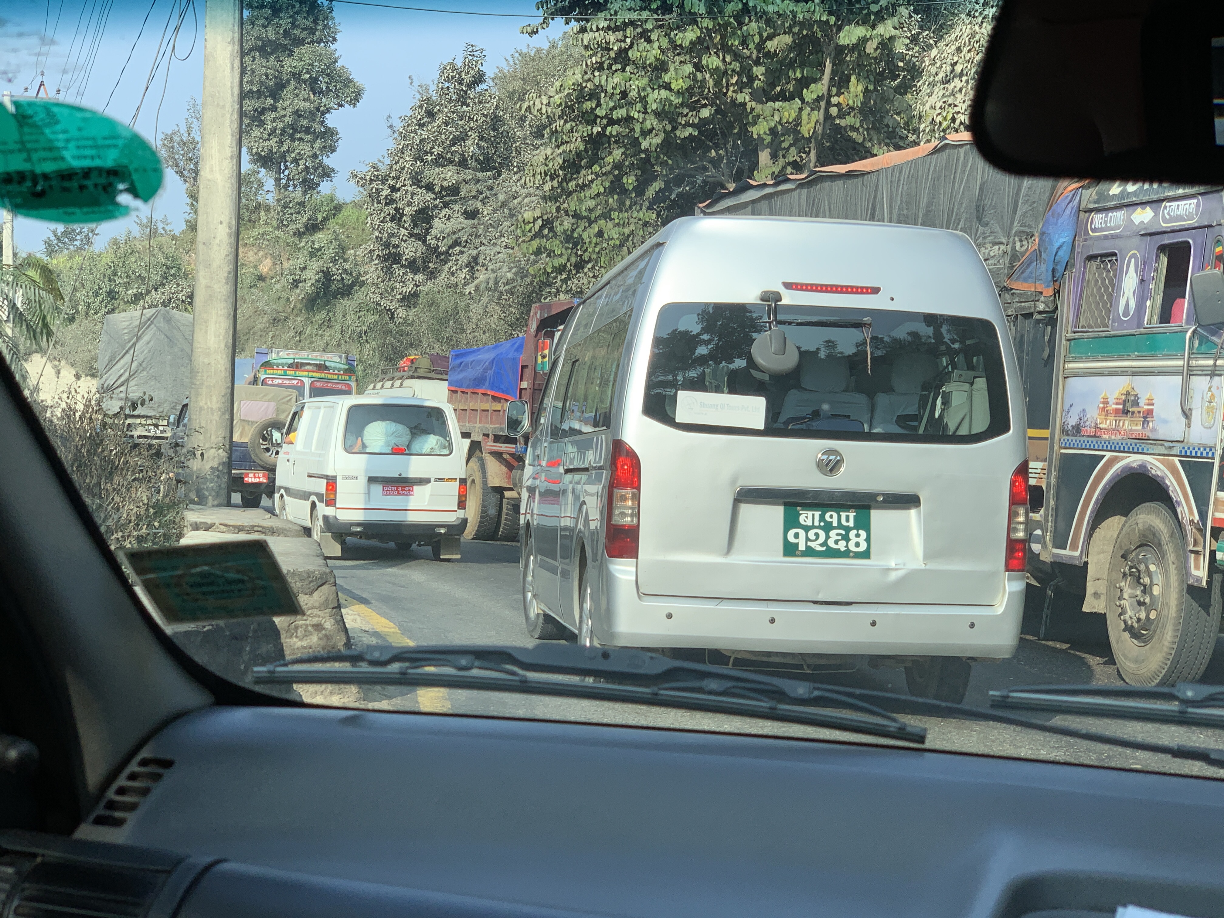 Traffic heading out of Kathmandu. Hard to know which lane is which many times!