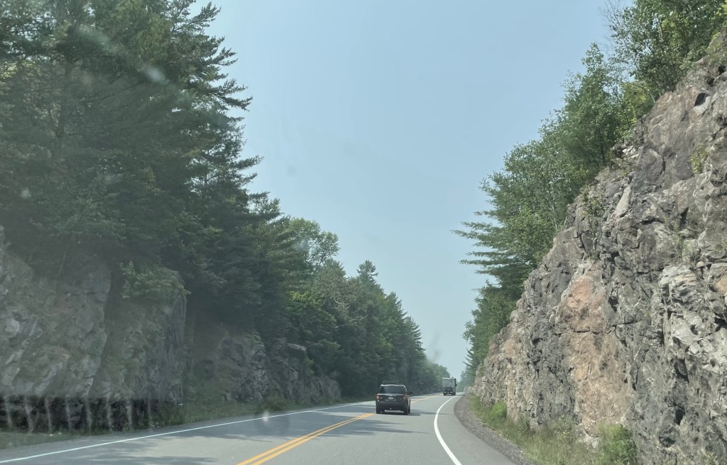 The journey today was lovely, and very familiar. We took a route that went north of Toronto through some gorgeous Canadian Shield territory. Rolling farmland in they south turned into a vista dotted with lakes. We saw a consistent haze in the sky, apparently from the forest fires in Western Canada!