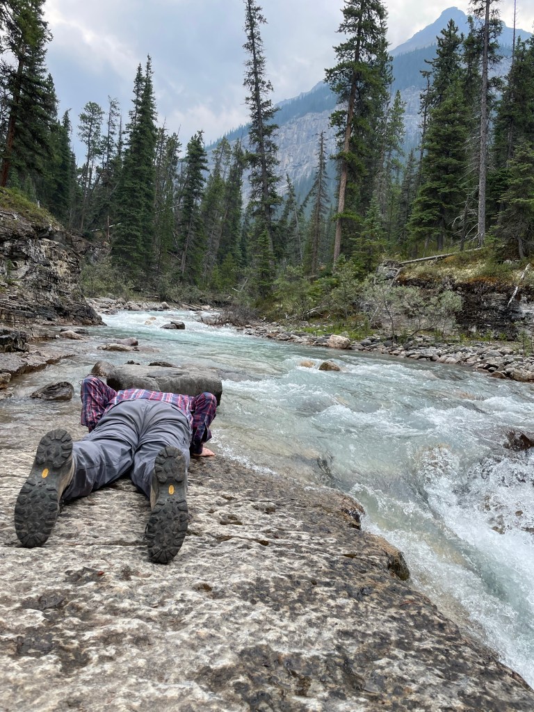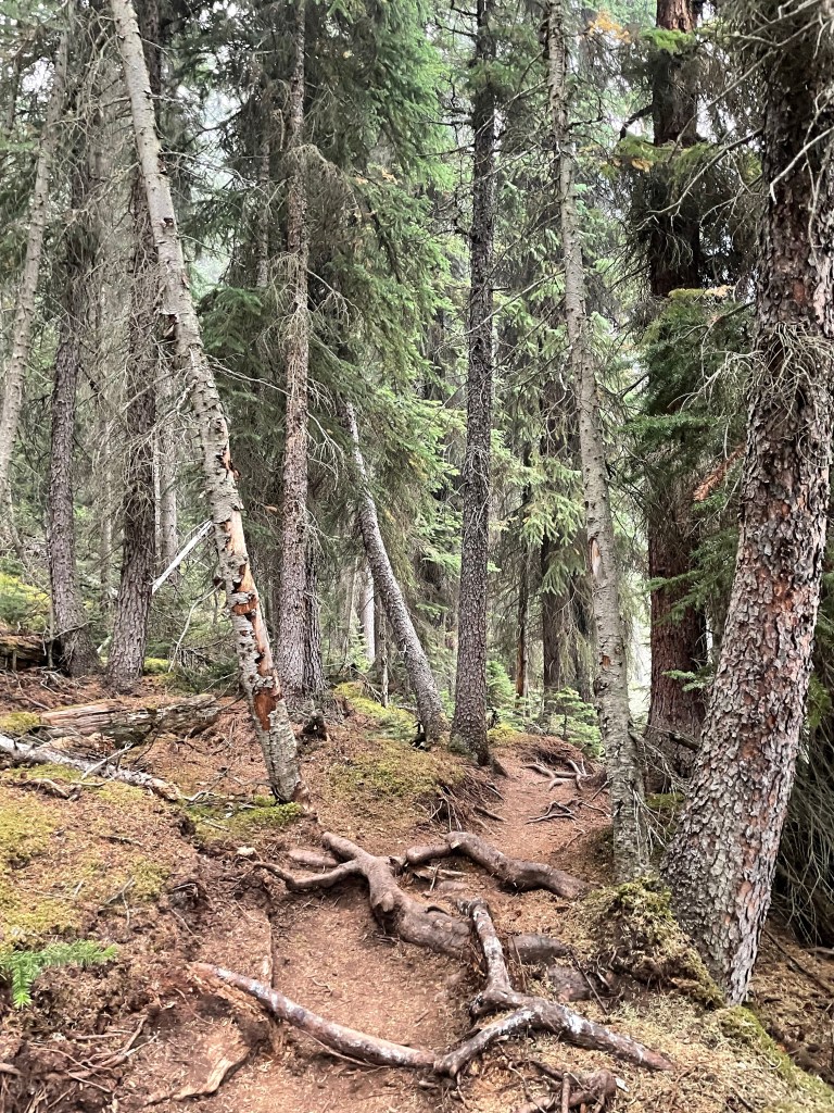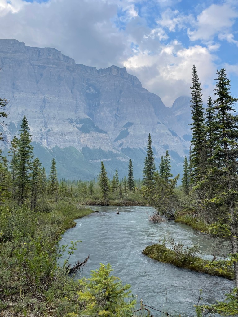 The Parks Canada trail went a short distance further, where we decided to stop for our lunch. The sun was trying to come out, and this would be the best spot we could think of for our stop. Of course, we had been warned that taking the trail beyond the Parks Canada sign would take us into Grisly territory, so we were on alert while we ate! But who could resist the views!