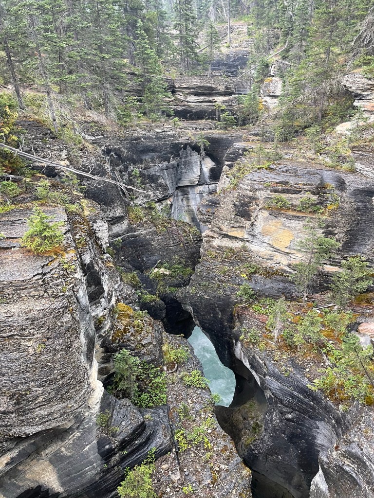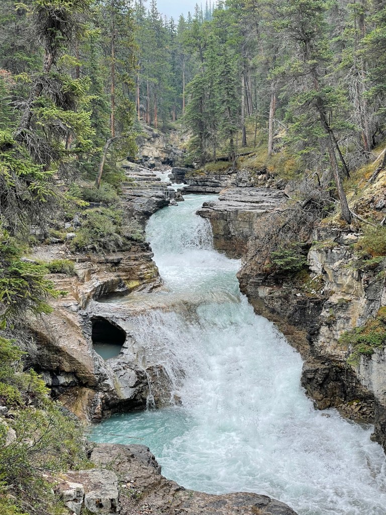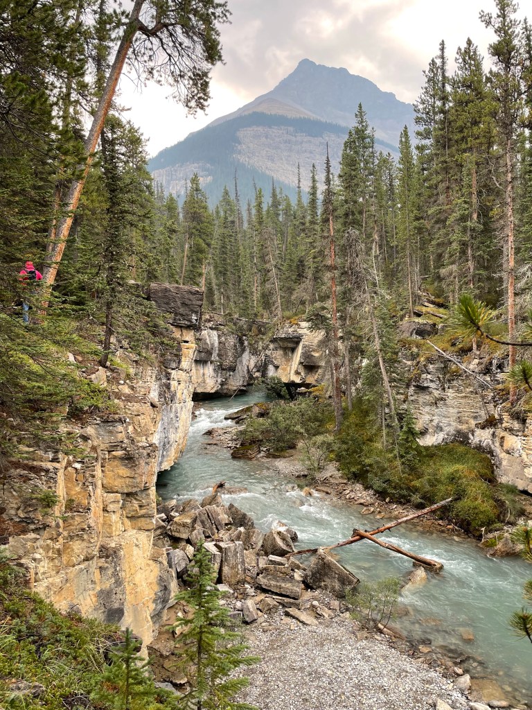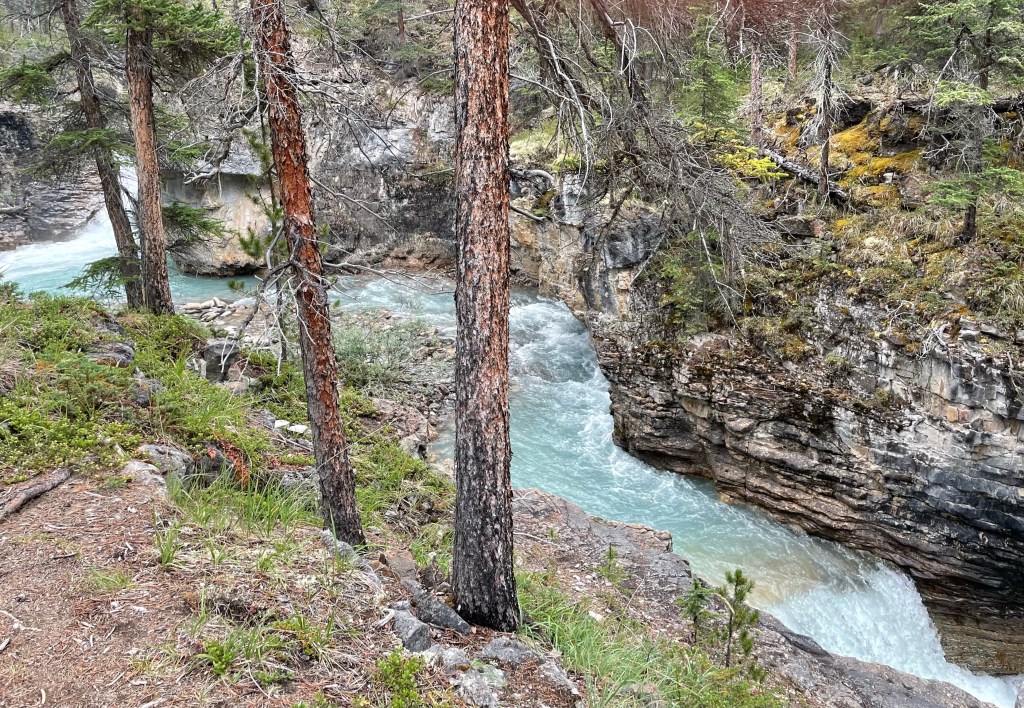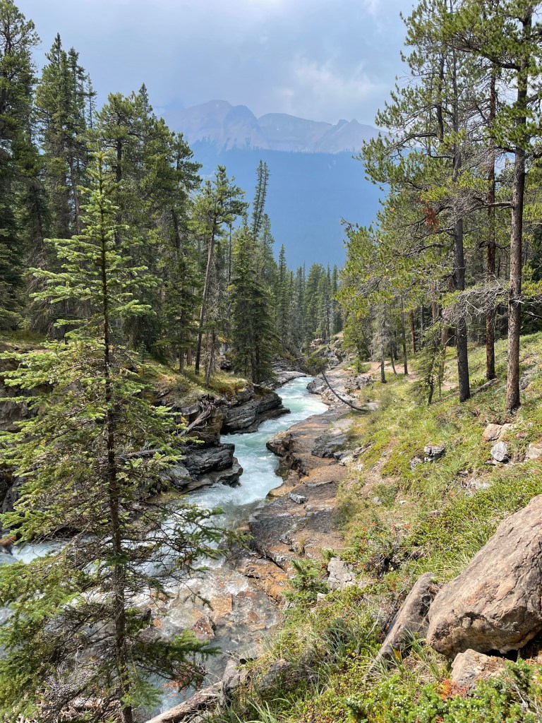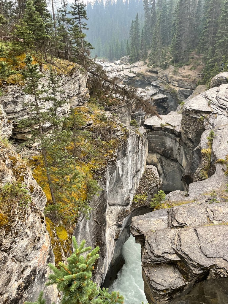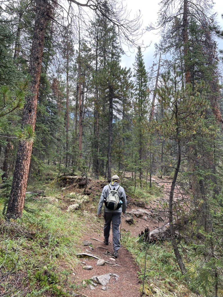 We could hike another km to the base of the falls, but the weather was changing and we decided to head back before we got drenched with rain. The temperatures were quite cool in the mountains and we didn’t want to get soaked, with no chance of warming up save a few hour visit to the cafeteria at Saskatchewan Crossing