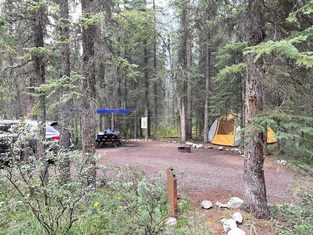We entered the park along with a long line of others. Because we had a “National Parks Discovery Pass” we bypassed the lineup and headed toward our campsite. We were again stopped just past Lake Louise for another park pass check and then proceeded on our way. Our campground is Rampart Creek Campground. A smallish campground on Rampart Creek which flows into the North Saskatchewan River.