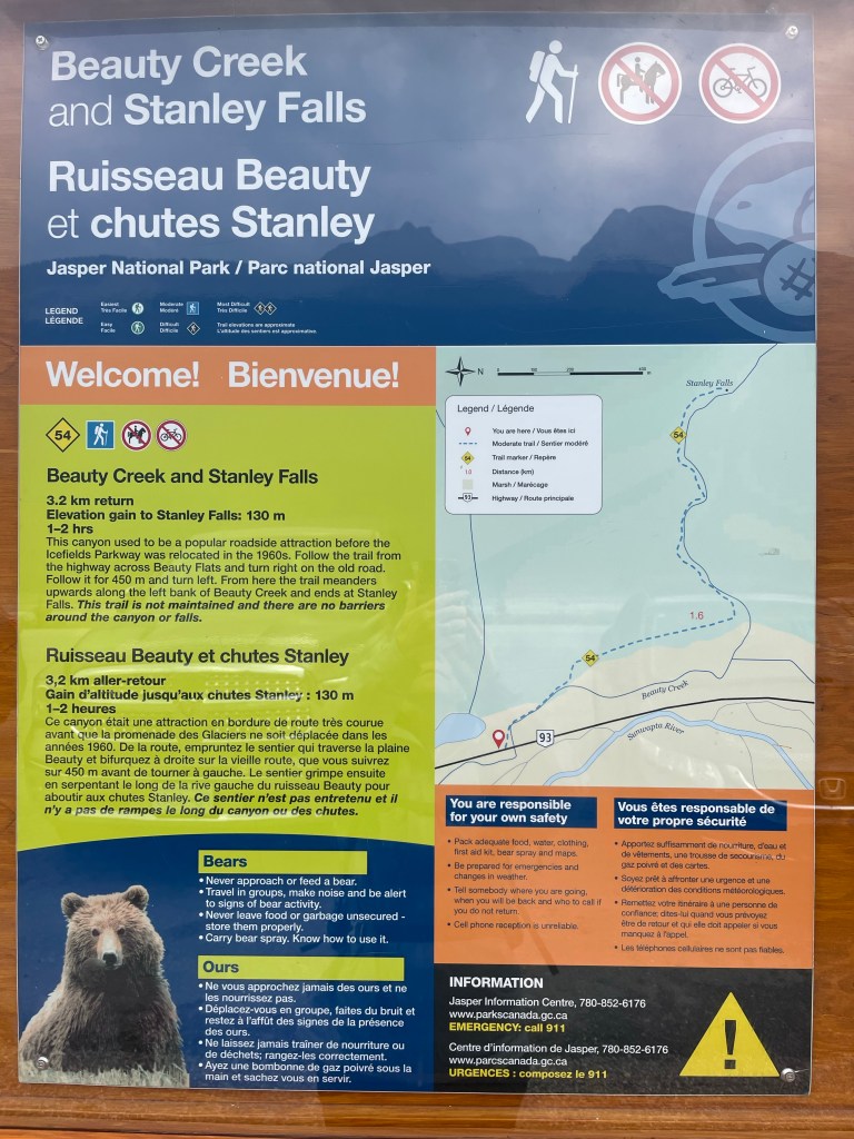 The first hike that we were advised to do was one that, while marked on the map, was not included in the park’s hiking guide. It’s a place called Beauty Creek, featuring Stanley Falls at the end of the hike.