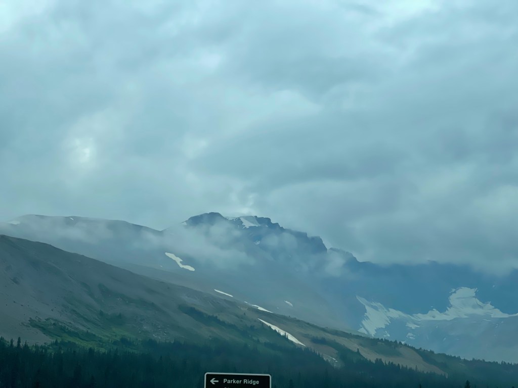 As we drove north through the park (we were only 30km from the Jasper Park border) the skies were overcast, but it seemed the rain had washed some of the ash out of the air and allowed us to see some mountains on our journey north.