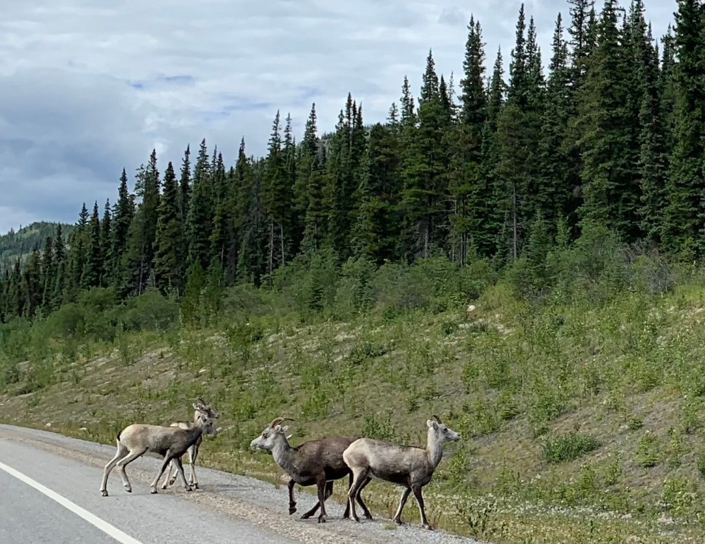 As we drove along we also were introduced to some interesting wildlife that frequented the roadside. First we saw a caribou out on his own, and then later we saw a few long horned sheep by the side of the road. We were ever watchful for wildlife not only for interests sake, but for what they could do to our car should we hit something that large!
