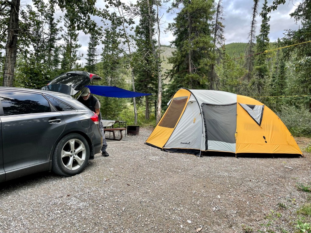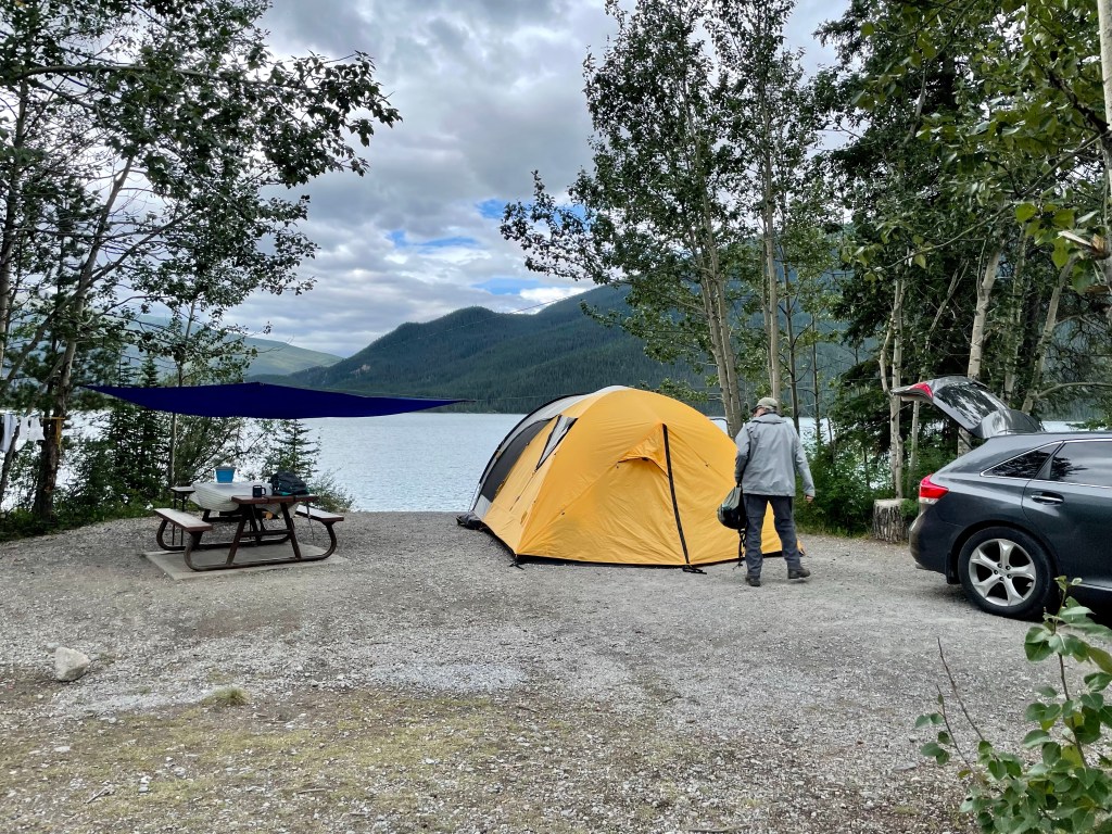 When we got to Muncho Lake, we knew there were 2 campgrounds there. The Southern most one called Strawberry Flats and the Northern one called MacDonald. We wanted to camp at McDonald, so we punched through as the sites were first come first serve. When we got to MacDonald, we discovered the campground was full by 4 pm (sad face) although we did do a drive through to confirm. We then headed back south to Strawberry Flats ( about 10 km) and scouted for a good site. There were not many to choose from and we took one that was not lakeside ( about 3 out of 15 here did not have lake access. Oh well, we set up and marvelled at the beauty of the lake!