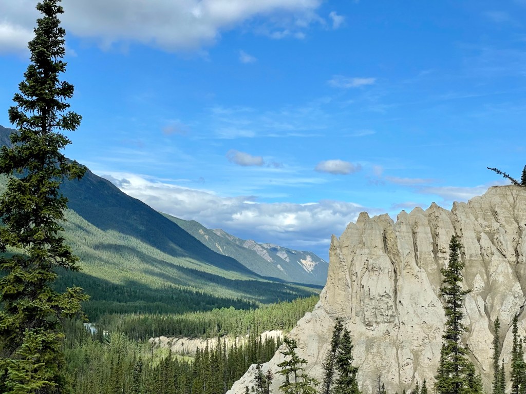 Our first stop was to the mineral licks viewpoint. A short hike took us to a lookout over the Trout River ( which ran out of the north end of Muncho Lake). These incredible hills were made of “Mineral Flour” a finely crushed stone that had been deposited during the glacial retreat. Because of its soft nature, the river eroded the silt until a valley was formed with these beautiful mineral hillsides guarding the river.