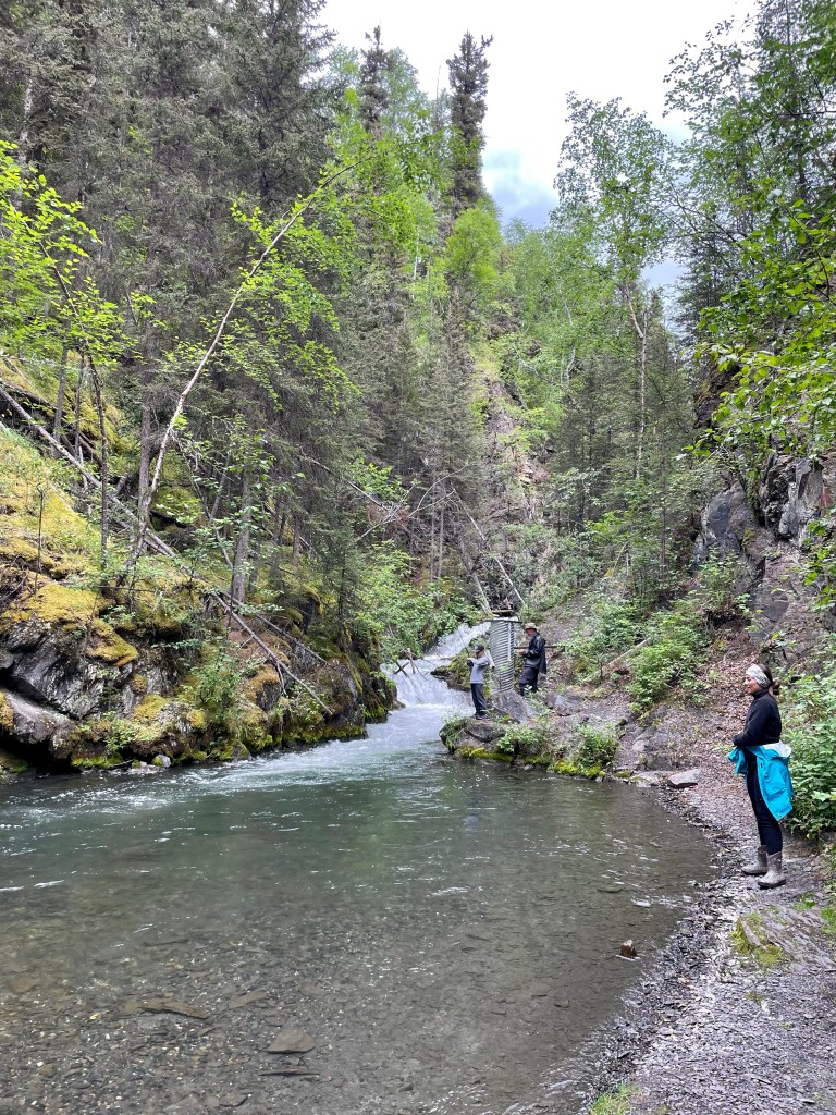 Our next hike was north of the Liard River Hot Springs at a place called Teeter Creek. Another short hike up along side Teeter Creek through lush woods until we came to a waterfall. Here, we saw a couple of families gathered to do some Greling fishing. They were just starting out and we wished them luck in their adventures and turned back along the trail heading to the car. We were no more than 200 m from them when we heard a whoop! Indeed someone had their first catch! I think it was going to be a fresh fish lunch for them if this kept up!