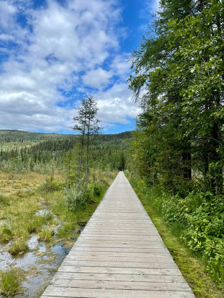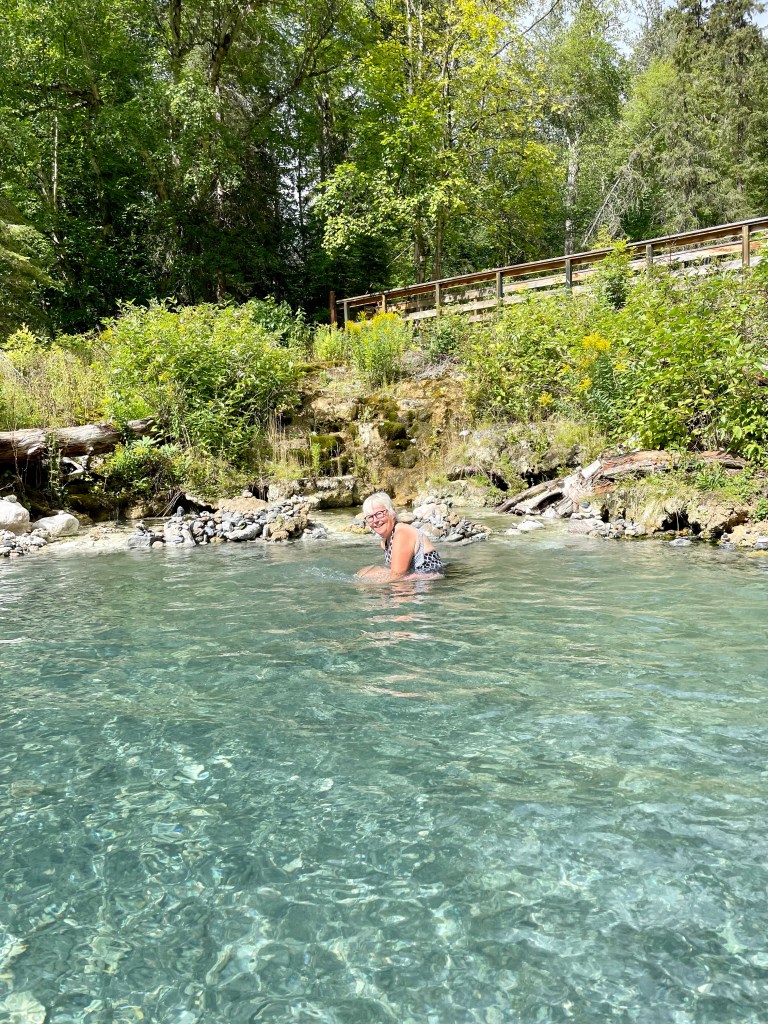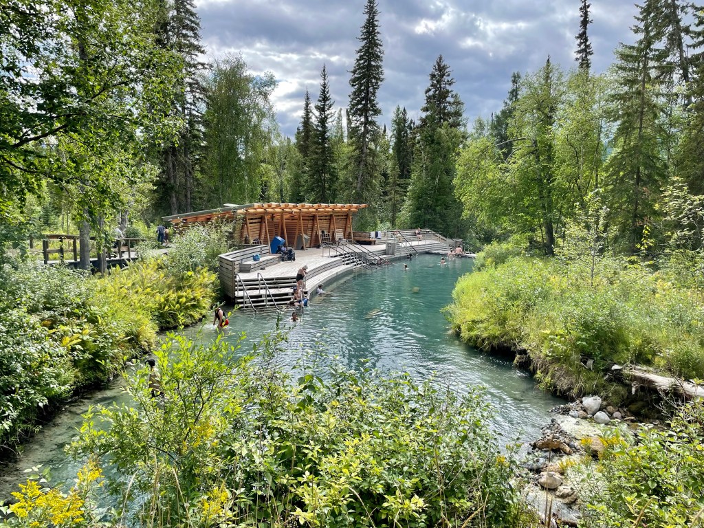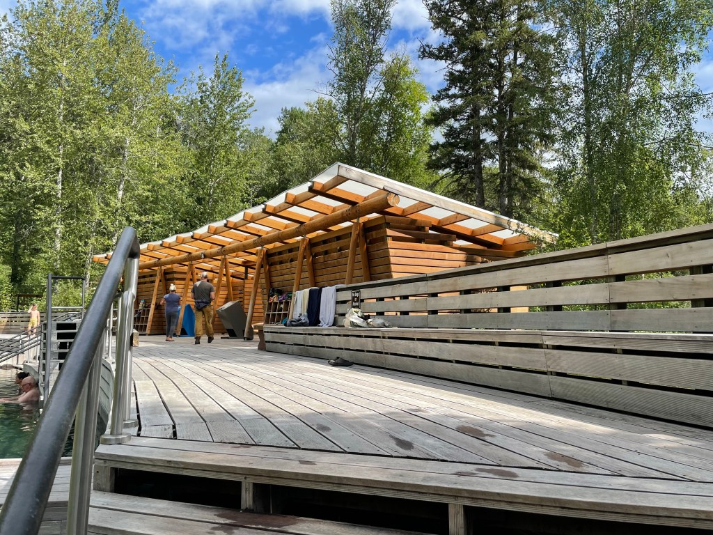 We got our pass, headed into the day use parking and had our lunch at one of the picnic tables there. Then we grabbed our swimsuits and towels and headed to the hot springs. Our walk took us along a long boardwalk through a marshy area often frequented by moose. After about 400-500 m we reached the hot springs. There was a fabulous set up for change areas as well as cubbies for our clothing.