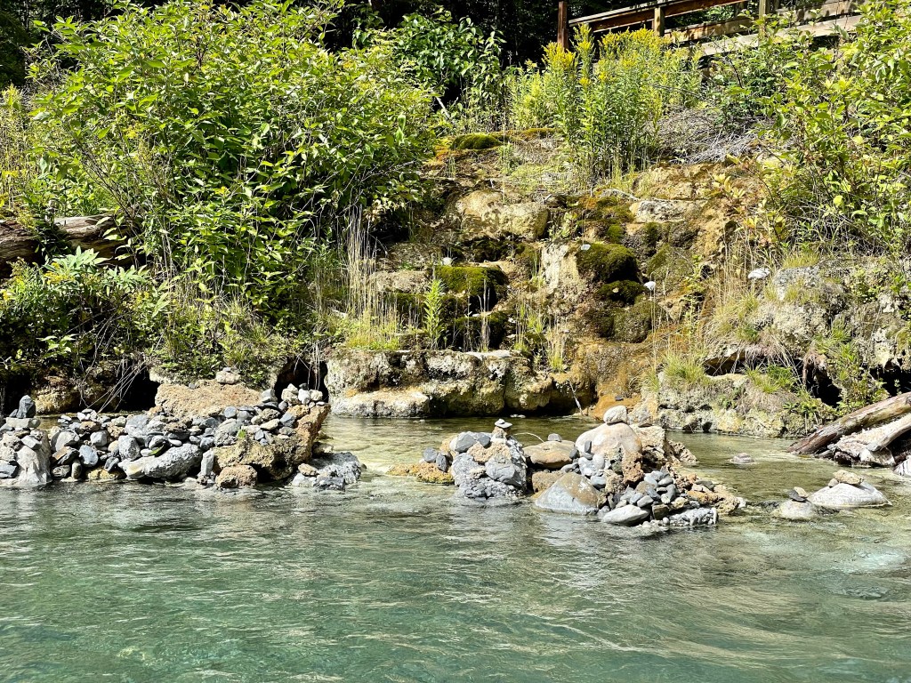 One of the challenges is to see if you can take a small stone from the bottom and lay it on the side of the tufa mound. The water coming from the tufa mound itself was just shy of boiling, so so technique was involved to accomplish this. Of course I had to try it! Suffice it to say, I got my stone balanced nicely on the edge!