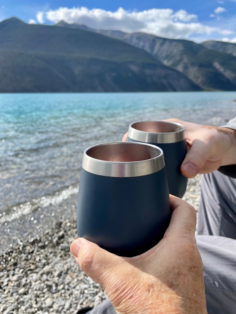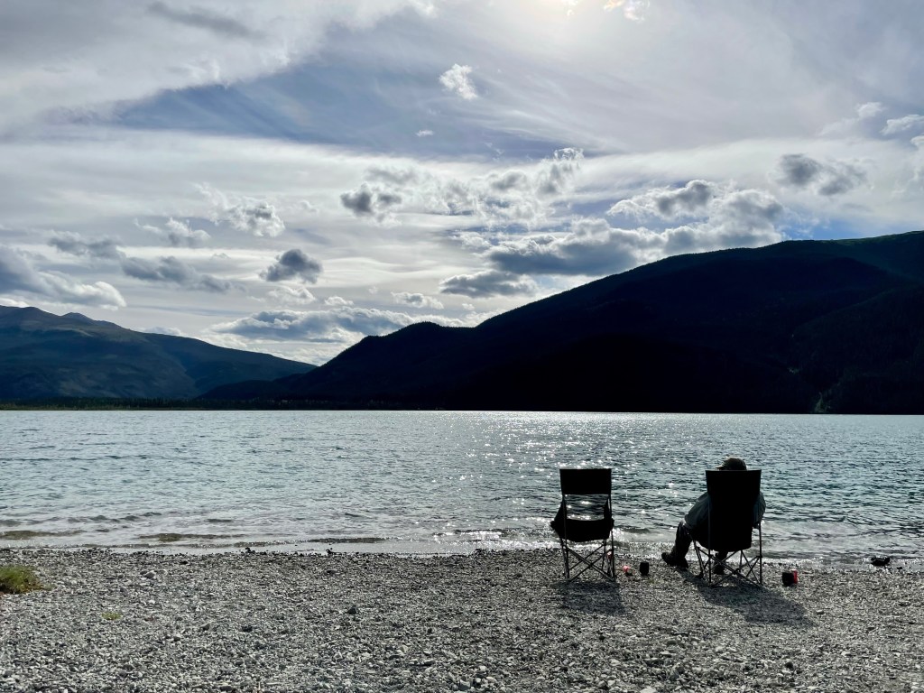 The shore called to us so we gathered our chairs and soaked up the sun with our cocktail in hand. Life is pretty good I must say! Dan built and amazing fire for us (indeed there was no fire ban in the Peace River Region )and so we were able to grilled some smoked sausages for our supper. Later we brought our chairs close to the fire and enjoyed a wee dram a we watched the embers die down. A perfect end to a perfect day! Tomorrow we would have to leave this paradise and drive north to Whitehorse; about an 8 hour drive all in all. With the fire out, and our glasses empty, it was time to get a good night’s sleep. Until tomorrow stay safe.