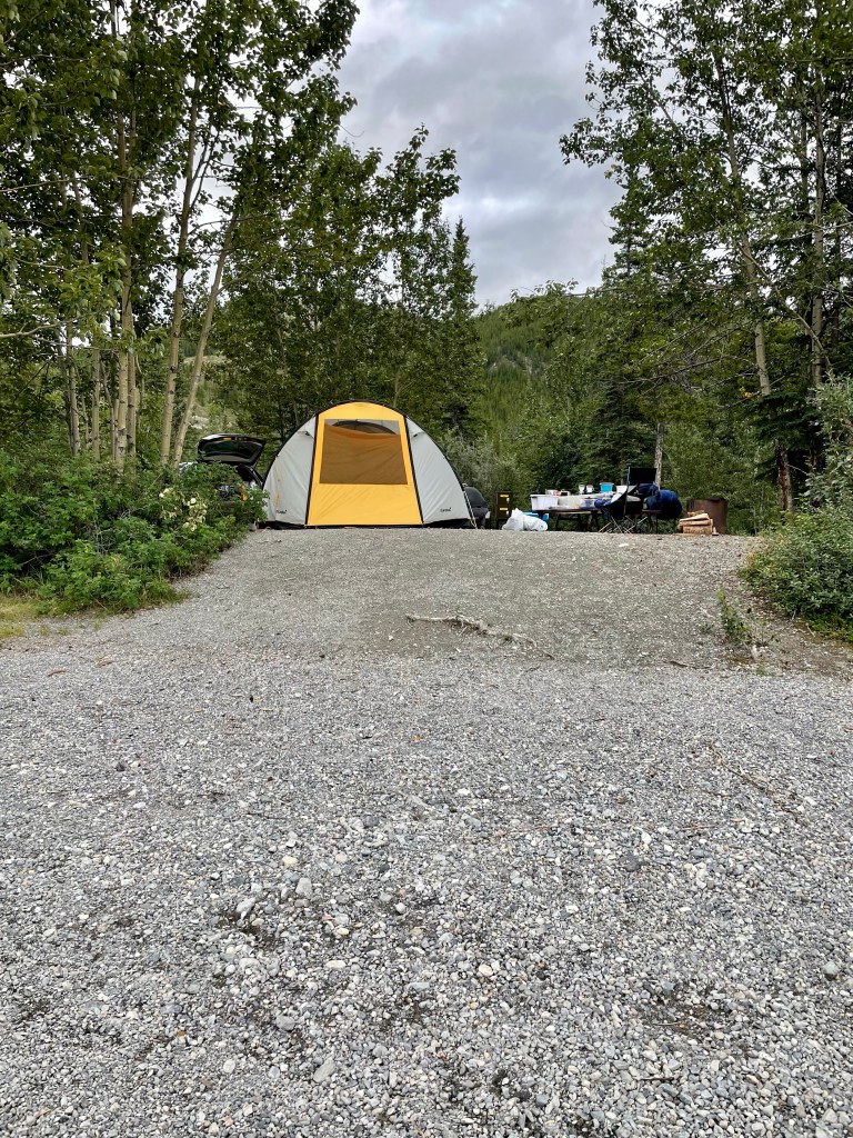 Last night we had a bit of rain. Both Dan and I woke up thinking that we would have to pack away a wet tent that would have to sit there for a couple of weeks before we would use it again. Oh well, I guess we can set it up to dry at our B and B in Whitehorse if need be. The night wasn’t as quiet as the night before as there was a large truck coming along the highway that got. Its gear stuck and not only grinder them but had to apply the air brakes as well. Small price to pay for our piece of heaven last night!