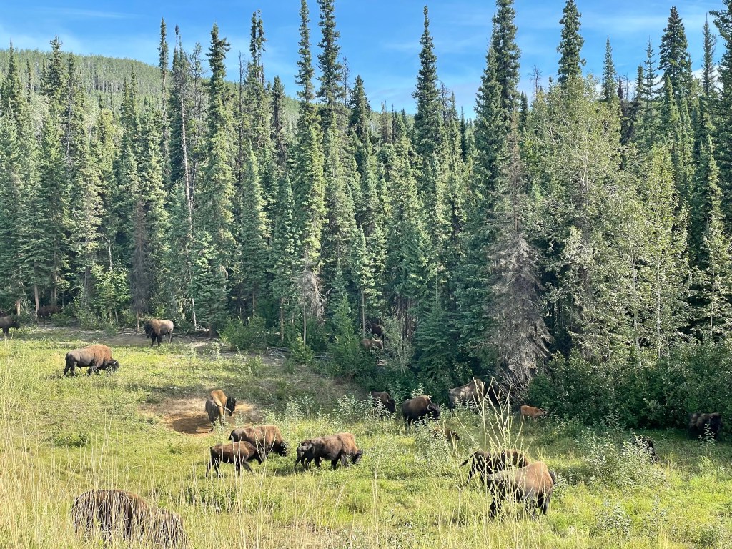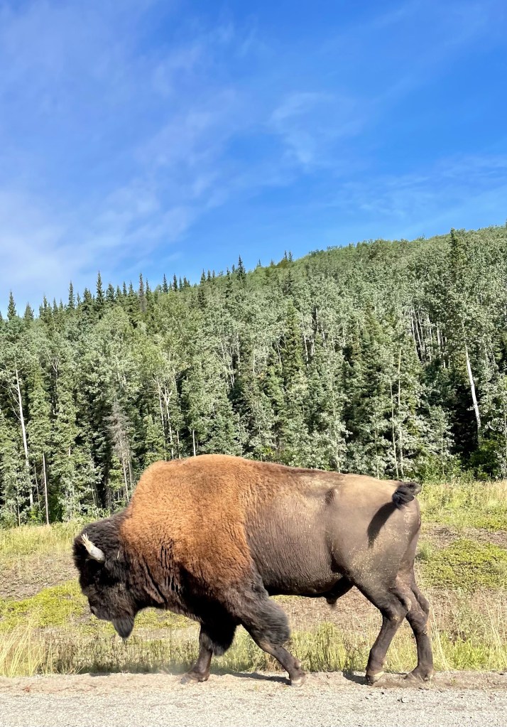 Our park attendant from Muncho Lake told us about this herd, and also one south of the park; the latter having tuberculosis within the herd and therefore had to be separated from the northern one. Some of the bulls were wallowing in the dirt, while others were quite brave and sauntered right next to the highway without a care!