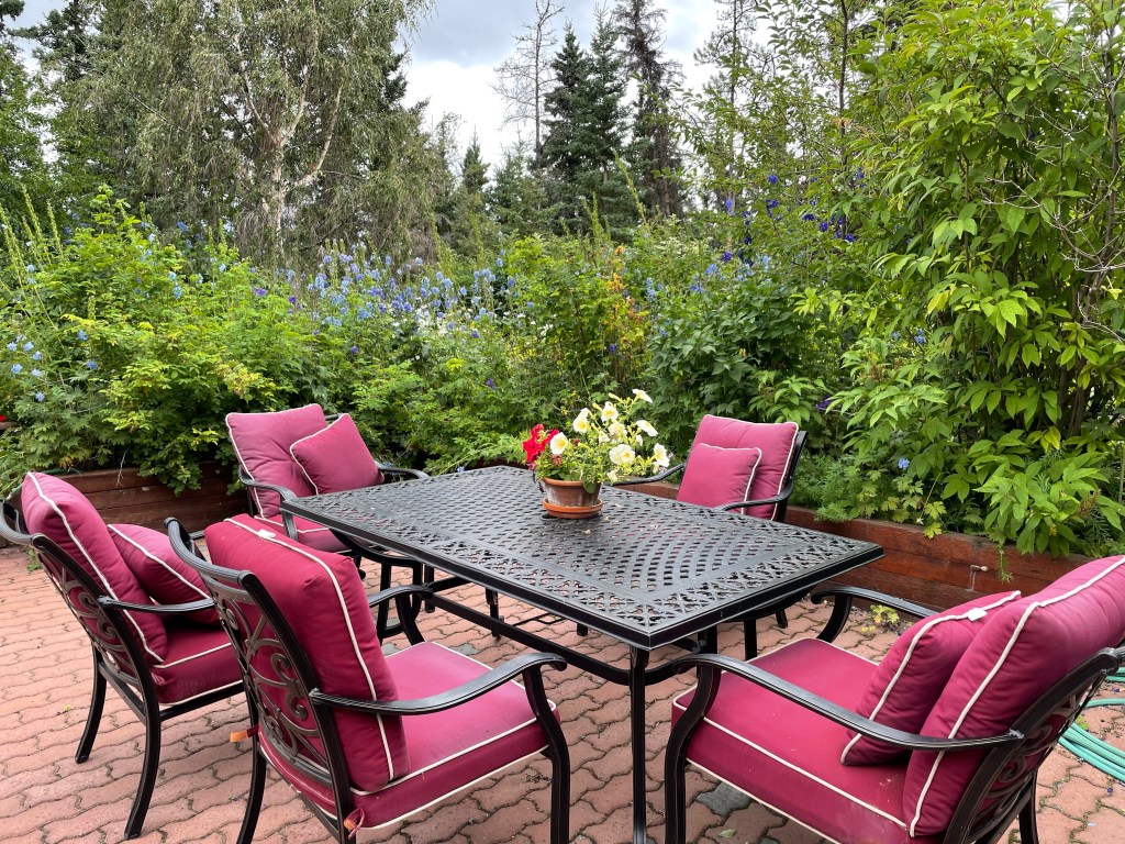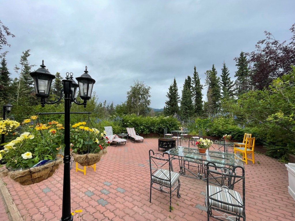 We continued west and then north to Whitehorse. With lunch in the car, we were ready to get out and stretch out legs by the time we got to our B and B. It was about 14 kms past Whitehorse, tucked back in a lovely valley with mountain views surrounded by beautiful gardens. A quiet oasis for us. We checked in and learned that we could do our laundry here instead of having to go into town to a laundromat. Oh happy day!