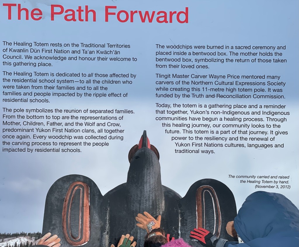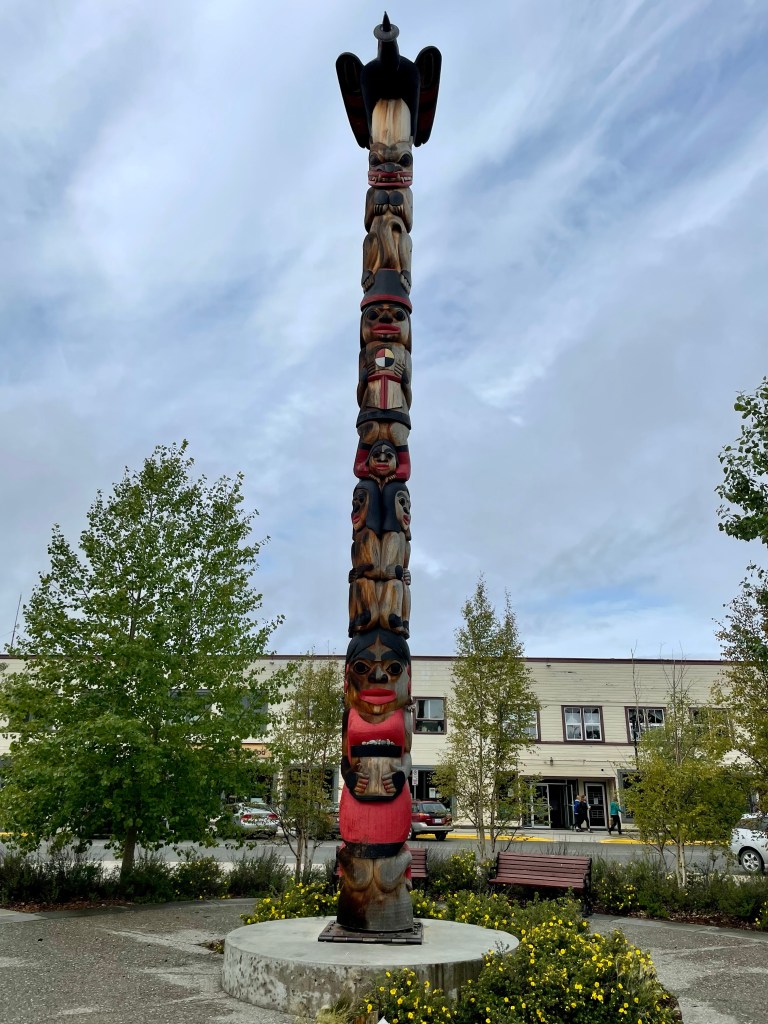 We did some shopping as Dan needed a warm long sleeved sweater or fleece, and then we were off to the visitors centre to see when info we could get for our time in the Yukon. The attendants there were exceptionally helpful and we were loaded with information for our trip! We then headed off to a local book store to get a guide book on hiking in the Yukon. With that found, we headed back to the car and took a short walk along the waterfront where we discovered a totem called the Healing Totem that is dedicated to all those affected by the residential school system.