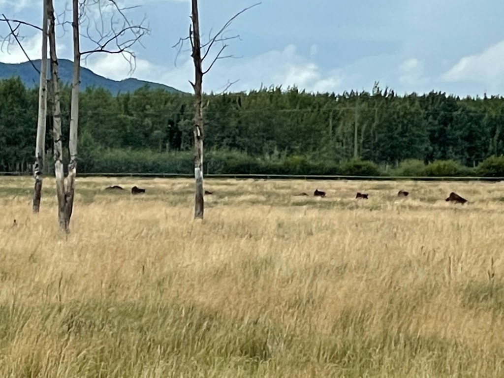 We passed by familiar sights from our touring yesterday, still in awe of the views looking north up this valley. We kept looking for the lone bison and low and behold we saw him! Then we saw his herd…it was all very exciting and a number of vehicles stopped to take a look and take pictures (us included!)