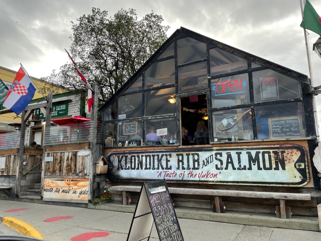 Once we got ourselves checked in, organized and showered we readied ourselves to go back into town for dinner. We decided to try. A popular spot called the Klondike Rib and Salmon House. Dan had an elk stew and I had salmon skewers. Both were exceptional!