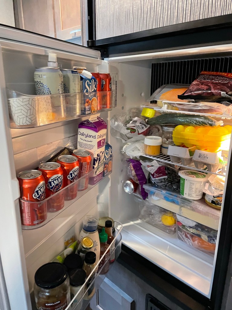 Our RV frig has a freezer which allowed me to buy meat to freeze for our journey north. The frig was a good size, and is well stocked with fresh fruits and veggies for our trip! Then began the organizing of the cubbies and drawers and ensure everything was secure before we headed out. What we thought would be an hour process ended up being closer to 3 hours by the time we heard out the gate.