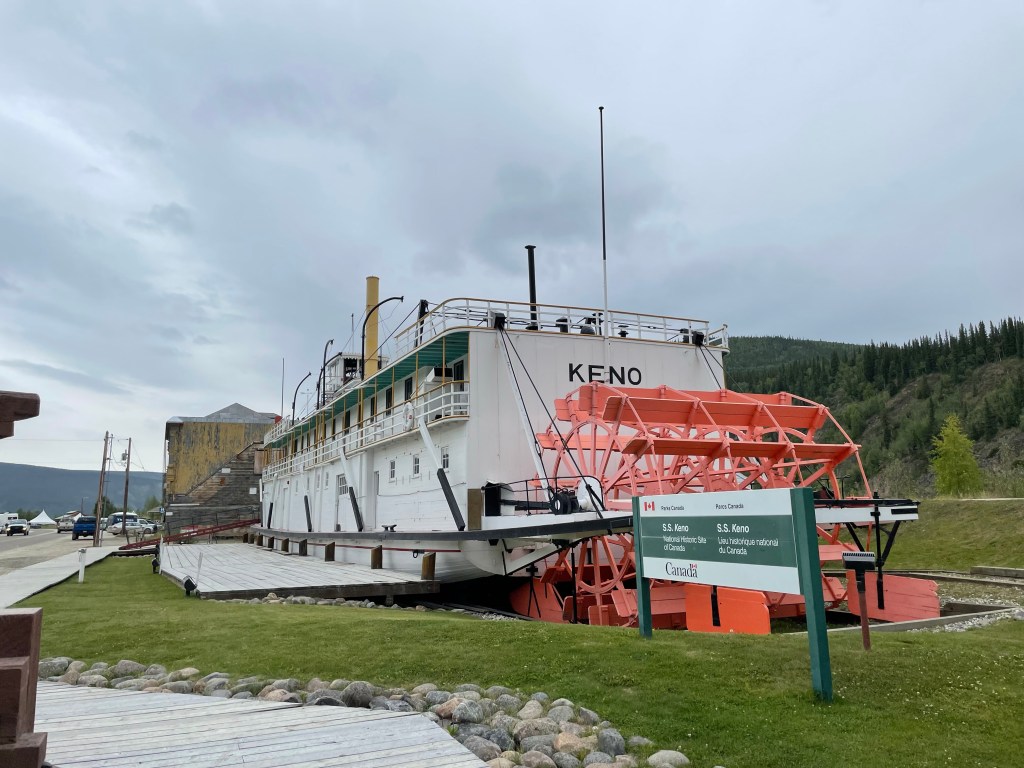 After the tour we grabbed a quick lunch as our next tour was to explore one of the working paddle wheelers, the Keno. This paddle wheeler was a work horse, burning ¾ of cord of wood per hour, carrying cargoe and pushing barges up and down the Yukon river. While many others transported people, the Keno was cargo only. She was 140’ long, a beam of 27’ and a draft when fully loaded of 24”. Very shallow for this size of boat. But shallow was survival here because the silt in the Yukon River, created sand bars faster than you could blink! Each run had the navigator documenting where the latest hazards were so the next pilot could have a chance of navigating through.