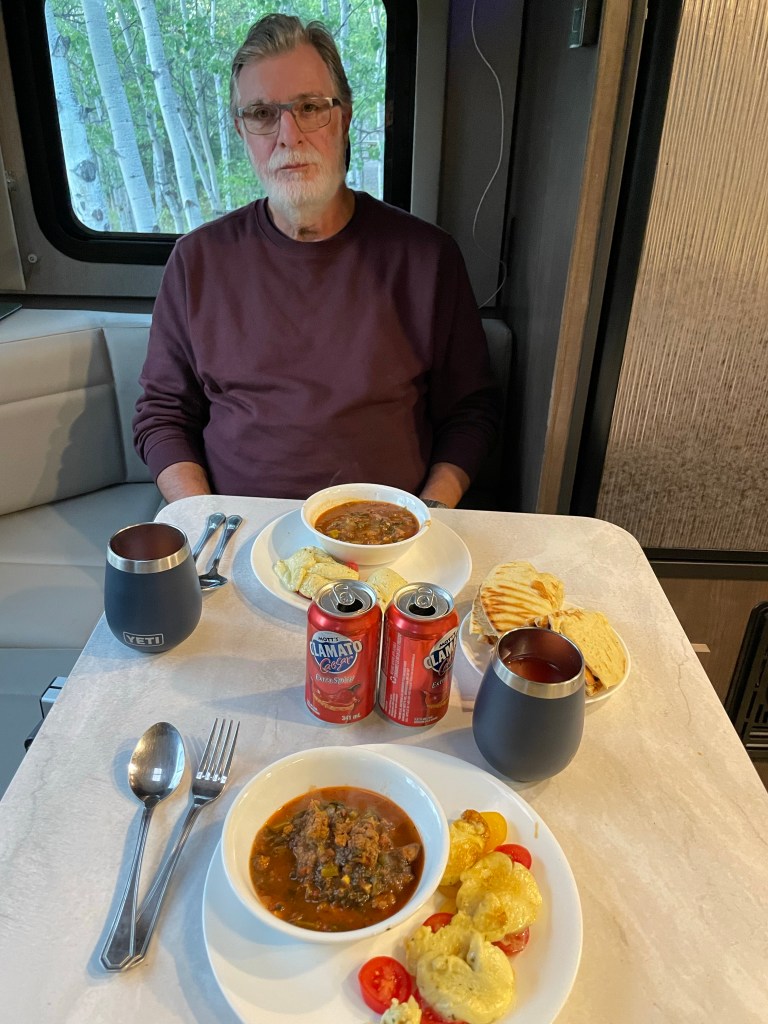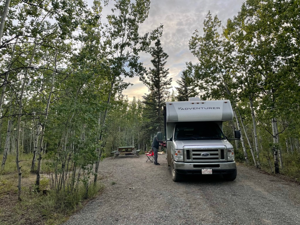 I made us a quick dinner and we settled in with our drinks to relax. We had driven another 500 kms almost straight south again today. Although it was light when we got to our campsite, it’s almost dark at 10:20 pm as I write this. (We haven’t seen darkness when we were on the Dempster unless we set an alarm!). It is also noticeably warmer! We actually have the windows open in the RV, and probably won’t need the heater tonight! Life’s simple pleasures!