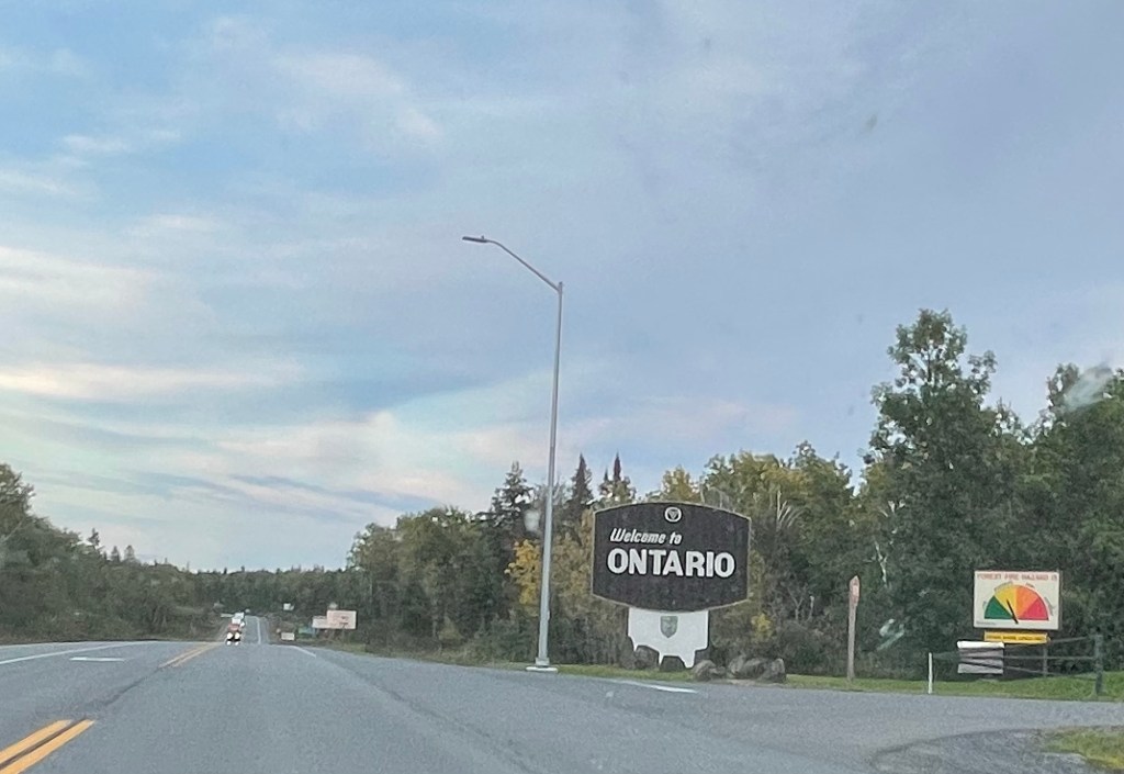 Soon ( we’ll a few hours plus a lunch and gas fill up in Winnipeg) and we were at the Ontario border. No mistaking the cut rock faces of the Canadian Shield!