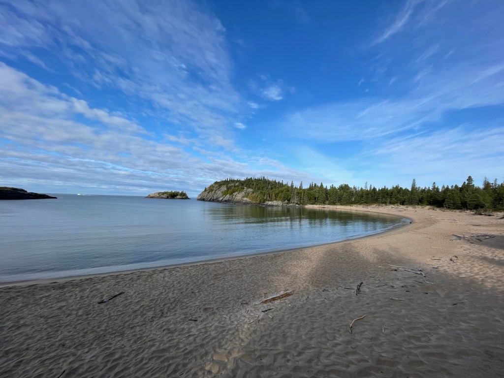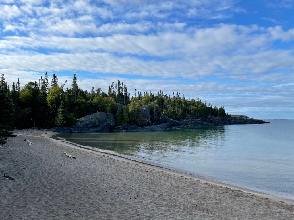 We woke up to the drip drip of condensation coming from our tent fly. While the evening was clear, the cool temperatures once again caused quite a build up of water on the inside of the fly sheet ( our tent was very dry however). We set to breaking camp and packing the car. Once we packed the car Dan and I decided to do a short hike out to the Lake to see some of the views. Gorgeous sandy beaches bordered by huge rock outcroppings. It is no wonder this area ( the Algoma and Agawa) inspired so many painters of the group of seven.