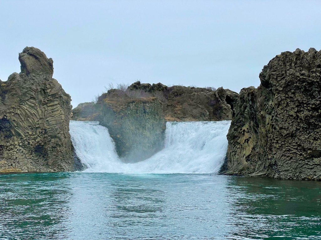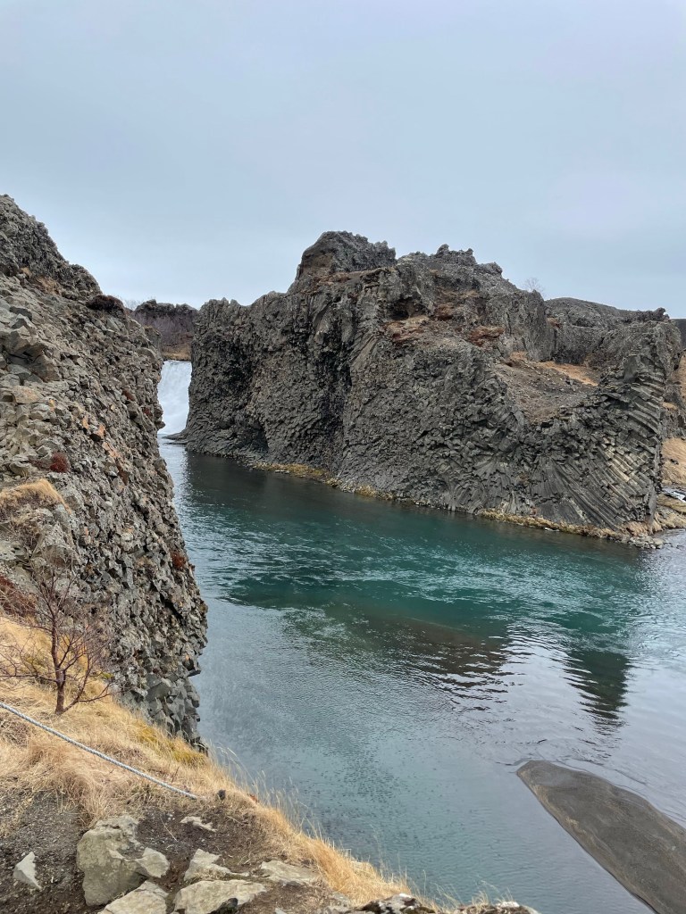 Our first stop was Hjalparfoss falls. Here we saw a lovely waterfall surrounded again by a complex basalt formation formed as a result of cooling lava.